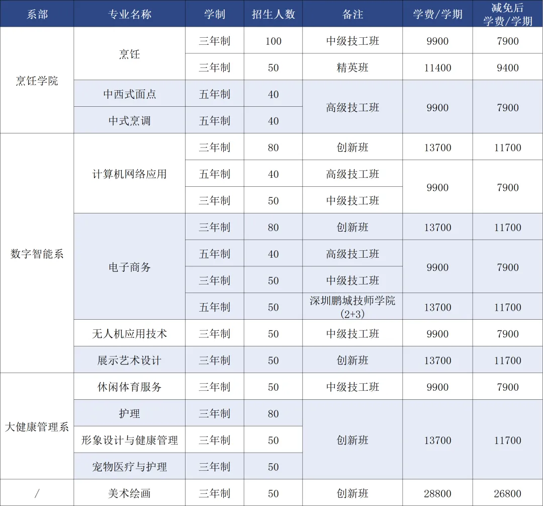 农村户籍、深圳户籍等符合条件的学生,中级技工三年学制专业可享受国家免学费补助4000元/年,三年共12000元;设计类专业每年补助4500元,三年共13500元(报名时可直接减免);高级技工五年学制专业依照有关政策规定,只享受一、二年级国家免学费补助。