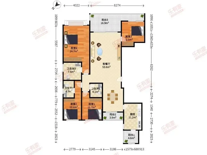 - 170㎡→实用约220㎡,4+1房4卫,双套房+保姆间