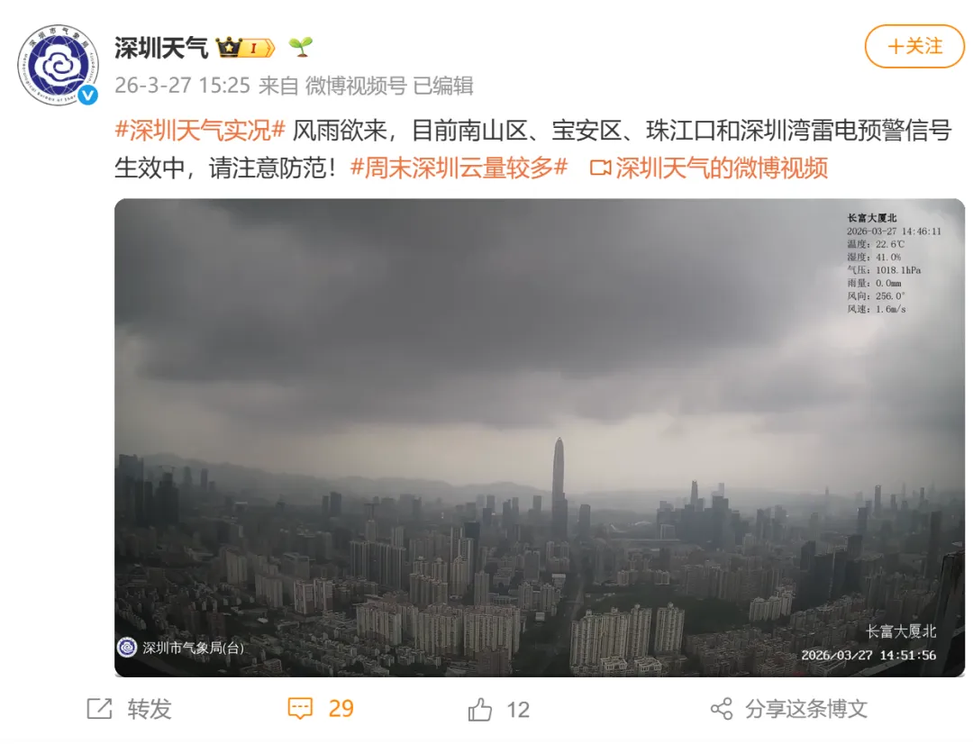 【深圳市分区雷电预警信号】深圳市气象台于2026年03月27日15时25分发布:目前南山区、宝安区、珠江口和深圳湾雷电预警信号生效中!