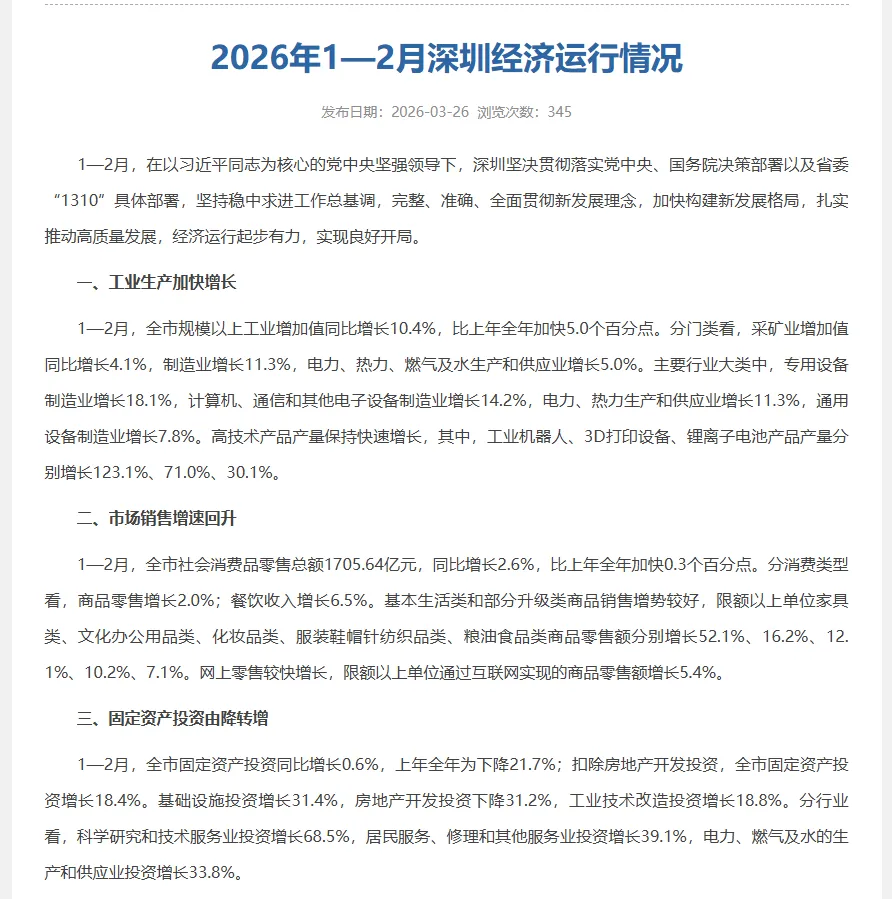 3月26日,深圳市统计局发布2026年1-2月经济运行数据,全市经济起步有力、实现良好开局,多项核心指标同比大幅改善。作为房产博主,今天就带大家拆解这份数据,读懂背后与深圳楼市息息相关的底层逻辑,帮大家理清2026年置业方向。