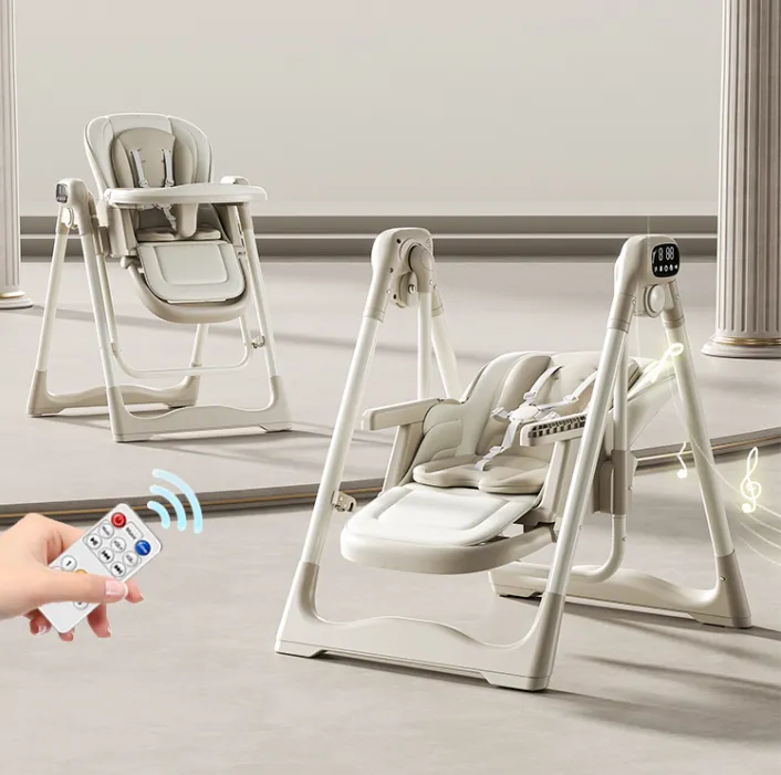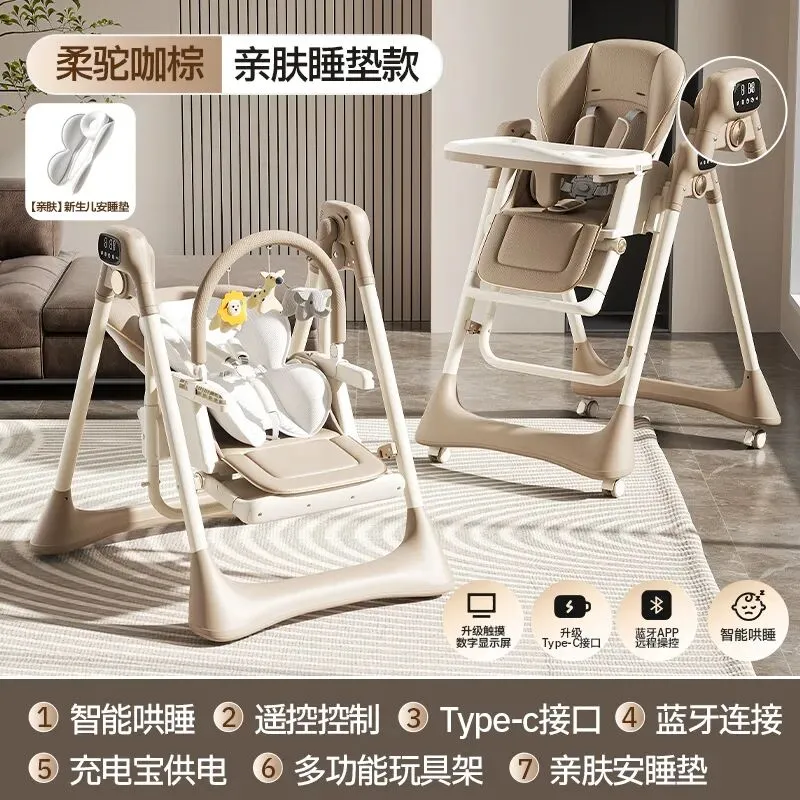 全新PP料、PU坐垫,可躺可坐可折叠,靠背6档调节,高低9档调节,脚踏3档调节,万向轮带刹车,带摇椅功能,智能蓝牙连接,专属APP联动,智能哄睡系统,可使用充电宝,可定时。