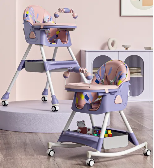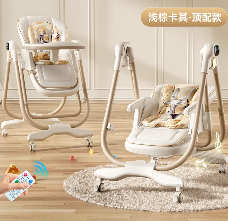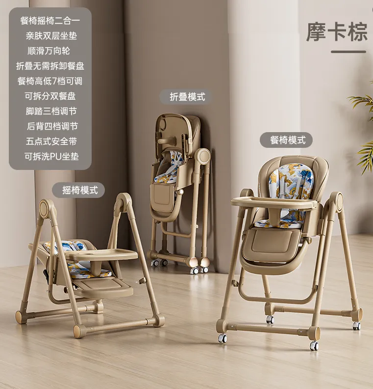 全新PP料、PU坐垫、可变摇椅,可躺可坐可折叠、靠背6档调节、高低7档调节、脚踏3档调节、万向轮带刹车、带摇椅功能,PU皮坐垫、双餐盘、五点安全带。