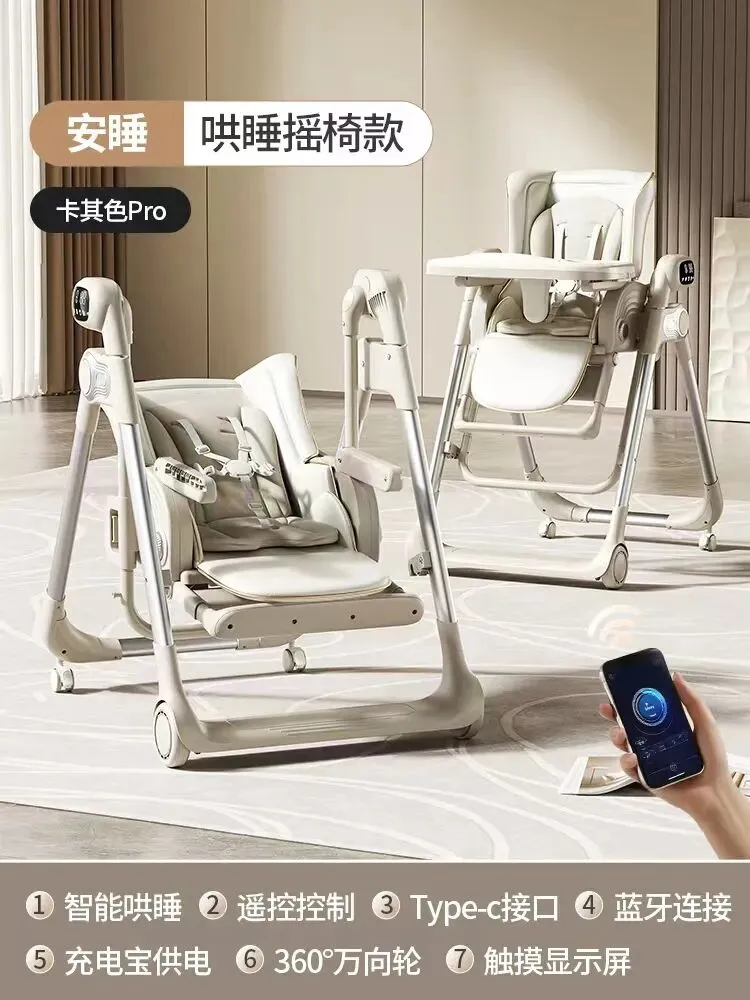 蝴蝶形状下脚更稳固,全新PP料、PU坐垫,可躺可坐可折叠,靠背6档调节,高低9档调节,脚踏3档调节,万向轮带刹车,带摇椅功能,智能蓝牙连接,专属APP联动,智能哄睡系统,可使用充电宝,可定时。