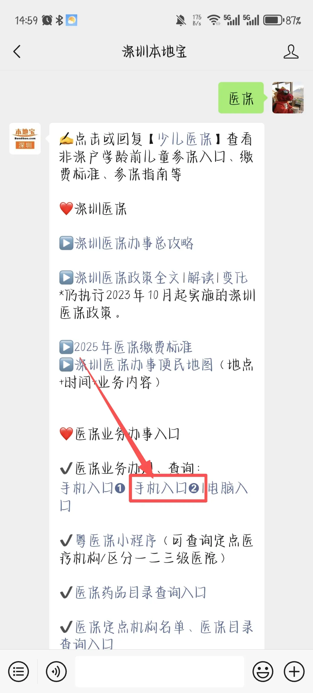 也扫描下方二维码,跳转【深圳本地宝】公众号回复【医保】关键词,然后点击手机入口2;然后跳转到深圳医保后点击医保网办、再点击掌上办事,未登录的点击登录,登录后点击门诊选点