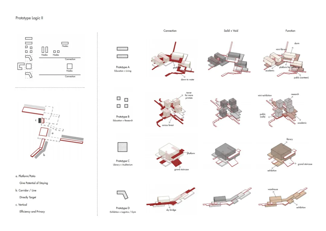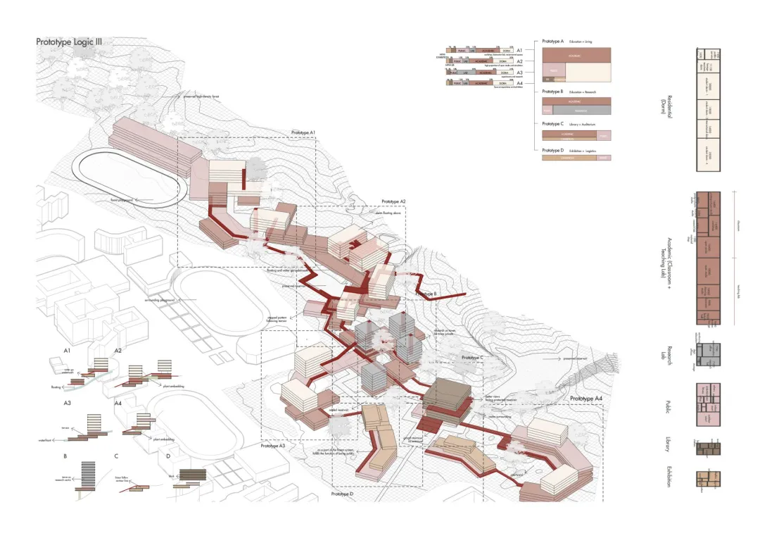 总体规划层面的抽象常常让学生失去尺度感,而模块尺度的设计更容易让学生理解空间品质——地形、森林、景观视野、水系,这些场地的独特特征如何在设计中转化为具体的空间体验。学生们被要求提出一个“原型”prototyping,在此基础上对更小尺度的建筑进行深化。