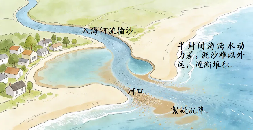 咸淡交汇促沉降:淡水带来的泥沙颗粒极细,遇到海水的盐分,就像小磁铁互相吸附抱团,颗粒变大变重,快速沉降到海底,日积月累形成厚厚的淤泥层。