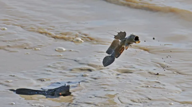 弹涂鱼在泥滩上蹦跳爬行