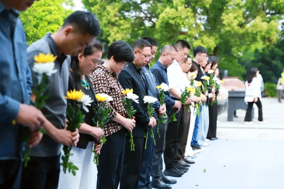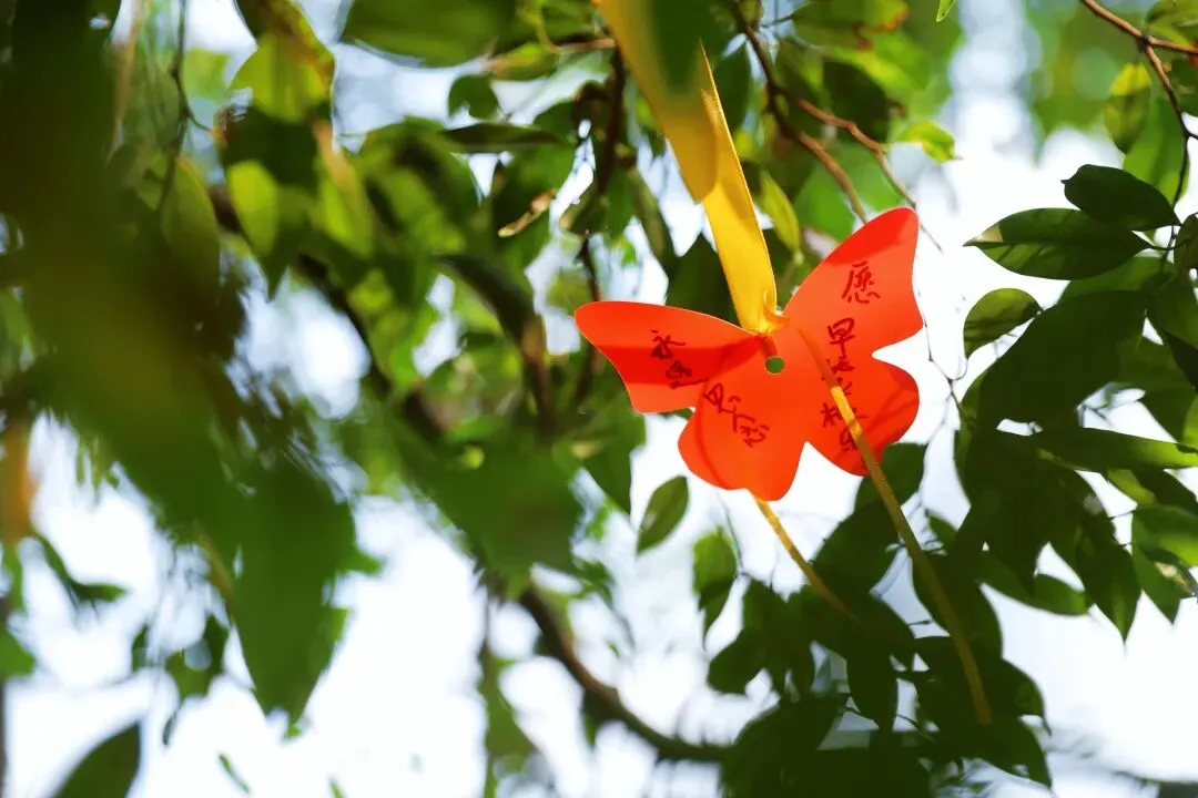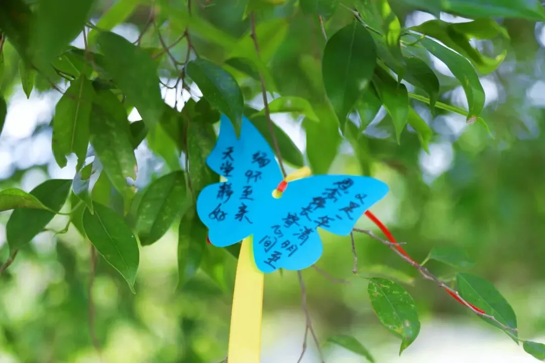 随后,大家有序地走向三棵枝繁叶茂的光明树下。队伍很长,人很多,却很安静。有人俯身将花轻轻靠在碑前,再起身走向树下;有人蹲在树旁,把花放在盘虬的树根边,再将手中的黄丝带轻轻系上枝头;有人只是静静站着,望着风中飘动的黄丝带和轻颤的枝叶,仿佛在与某个遥远的身影低语。