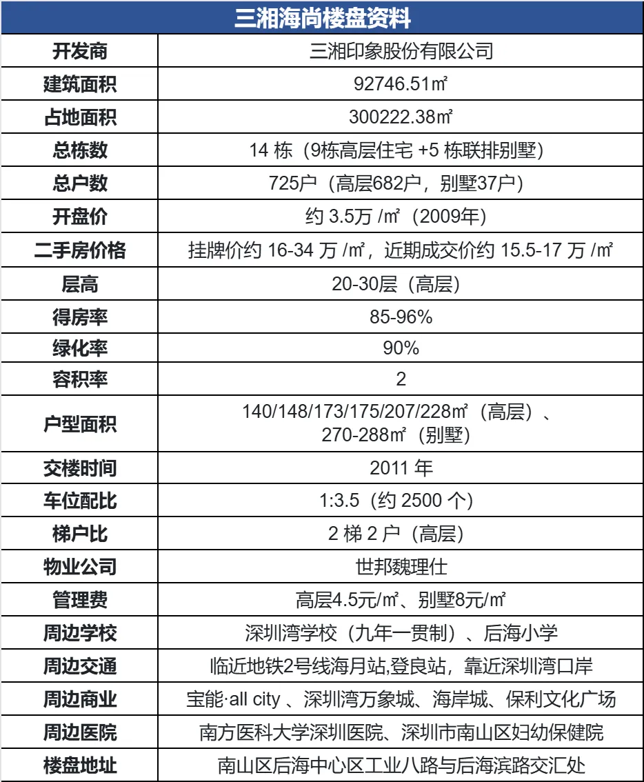 项目还配套太阳能路灯、地面渗水系统、水资源循环利用等基础节能设施,进一步践行绿色环保理念。值得一提的是,顶豪小区物业费高层4.5元/㎡,别墅8元/㎡,价格实在且品质到位。其物业是由五大行之一的【世邦魏理仕】负责管理,服务品质有保障。在户型结构设计方面三湘海尚主打“实用+稀缺”,没有花里胡哨的设计,却精准戳中改善家庭的需求。小区分南北两区:北区5栋30层高层,主打140-207㎡三房、四房;南区3栋20层小高层+5排别墅,小高层172-228㎡,别墅270-288㎡,只有37套,顶复仅有14套,而且整体使用率超高,达到85%-96%,在片区属于中上水平。并且所有房子都是纯板楼设计,楼栋为东南朝向,采光通风极好。户户有大阳台,除了B、D栋低层有遮挡,其他楼栋基本都能看到海景!就连楼间距最窄都有48米,最宽的地方可直接眺望香港元朗,景观视野好、私密性强、居住舒适度高。