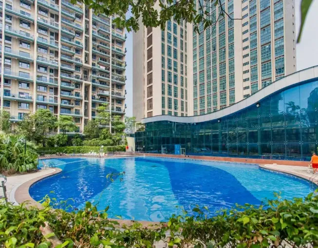 内部配套方面:小区两层架空设计,一楼是车库和商铺,二楼架空做了休闲区,下雨也能在楼下散步、健身。项目还配置了双泳池——400㎡的恒温泳池(片区最大)+1200㎡的室外泳池,周围绿植环绕,游泳像在森林里一样。