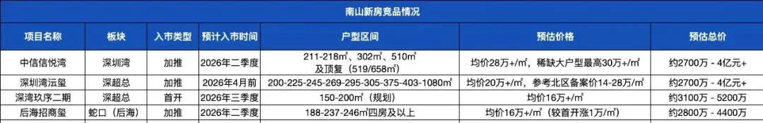 140-148㎡三房:入门改善款,阳台有大小之分,得房率约85%,户型方正,南北通透,客厅连接观景阳台,主卧带独立卫浴与衣帽间,次卧空间宽敞。2025年二手房成交均价约14.68万/㎡,2026年1月一套148㎡直接卖到2160万,相比25年11月涨了140万。175㎡4+1房:小区的主力户,也是卖得最好的户型。该户型空间灵活,既能做四房也能隔出一个书房做4+1房。户型采用大面宽中进深设计,避免了日照过强或暗角问题,客厅开间充足,采光极佳。高楼层能同时看山看海,是性价比最高的户型,得房率在88%-93%之间。2025年成交均价约16.44万/㎡。208-228㎡四房:高端改善款,拥有南北双阳台,通风采光极佳,主卧带独立书房和衣帽间,景观视野无遮挡,得房率可达89%-93%。25年成交均价约16.55万/㎡。顶复+别墅:终极改善款,顶复2025年成交1套,均价约19.41万/㎡;而别墅挂牌价在32-34万/㎡,稀缺到很少有人舍得卖。别墅为三联排和四联排设计。别墅采用地上三层+地下一层布局,自带庭院与露台,私密性极强,地下一层可改造为影音室、健身房或酒窖,地上三层为居住空间,主卧带独立露台,能全方位观赏深圳湾海景与大南山山景,且带精装与私家电梯,是深圳首个带电梯出售的联排项目。