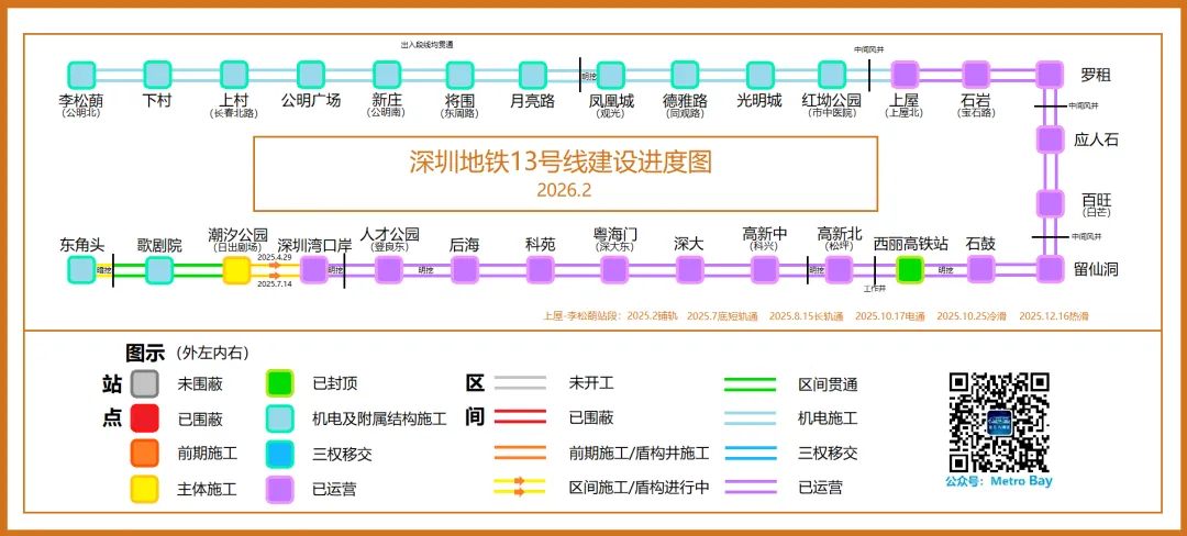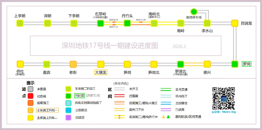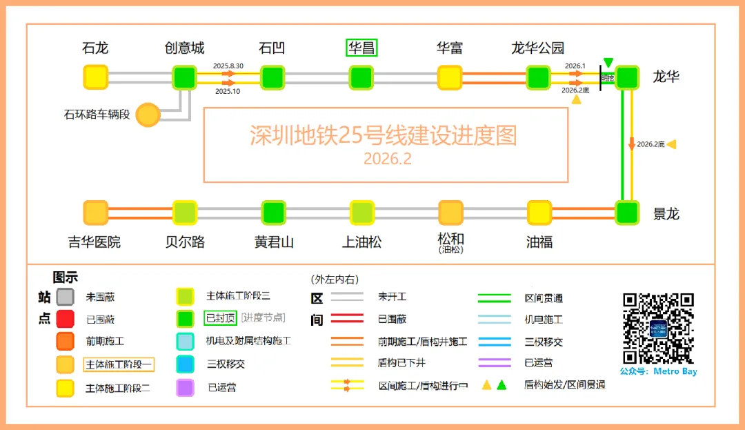 2026年2月适逢新春佳节,25号线一期给我们带来的节点更新消息有龙华公园站至龙华站区间明挖段主体结构封顶,以及2月10日前后华昌站实现主体结构封顶,而春节后复工的第一周,龙华站-景龙站区间左线、龙华公园站-龙华站区间右线、石龙站-创意城站区间左线实现三台盾构齐同始发。可以说25号线一期开工日期虽较晚,但有迎头赶上其他五期线路的劲头。