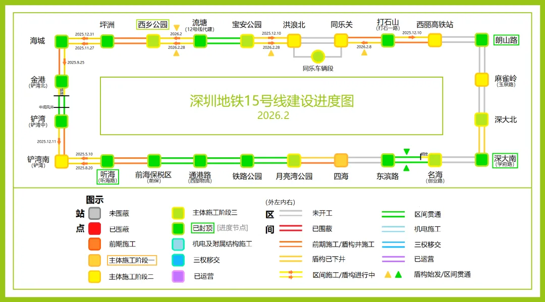 2月虽有春节休假,但15号线依旧取得了不少进展。本月初,15号线深大南站、朗山路站、听海站相继封顶,至此全线封顶的车站共13个,已经过半;同时,东滨路站-名海站区间右线贯通,打石山站-同乐关站右线始发。年后复工,15号线又于2月28日始发3台盾构机,分别位于同乐车辆段J6-J7工作井区间、流塘站-西乡公园站右线区间和洪浪北站-宝安公园站右线区间,展现出完美的复工姿态。