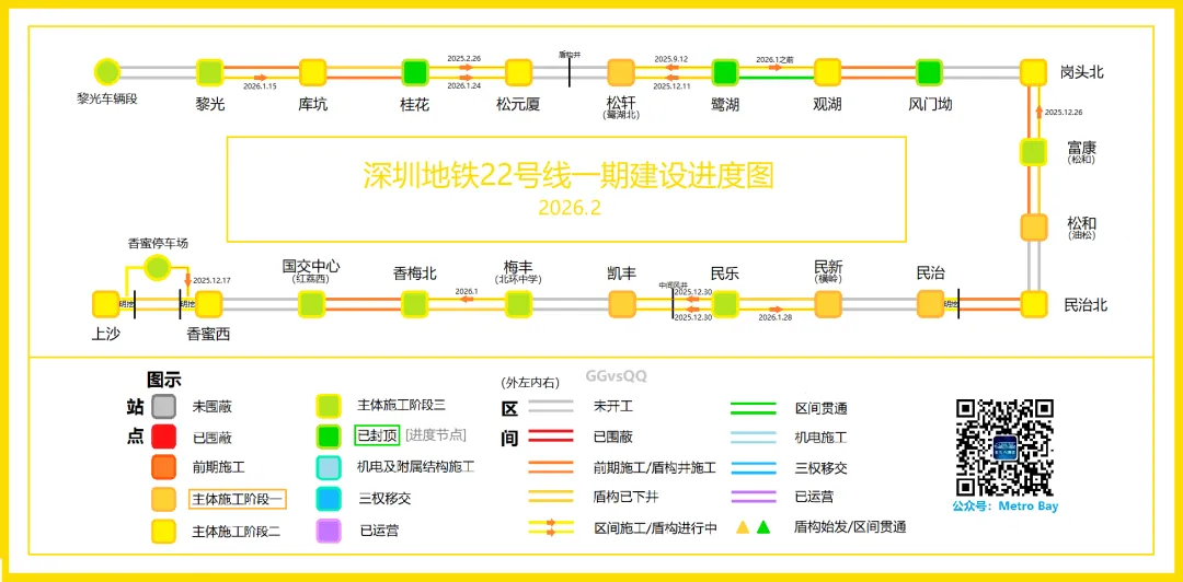 时间来到2月,22号线一期进展神速,完成封顶的有国交中心站北基坑,而南基坑已于2025年11月封顶,但车站中部主体站厅及站台层暗挖顶管截止至撰稿日尚未进场;盾构及顶管方面,2月7日香梅北站~梅丰站区间左线顺利完成盾构机刀盘吊放下井工作,标志着盾构掘进箭在弦上。
