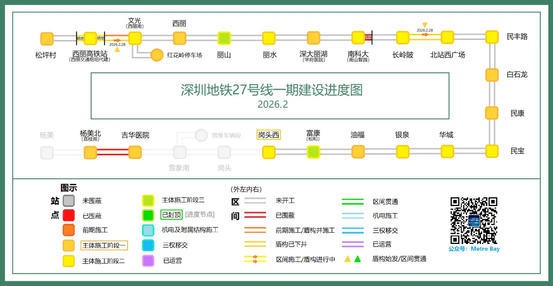 2月8日,岗头西站围护结构顺利封闭,进入主体施工阶段二,目前全线所有车站均在主体施工中,进度比较统一;此外,复工后的2月28日,27号线始发两台盾构机,分别修建长岭陂站-北站西广场站左线和西丽高铁站-文光站右线区间,这也是27号线一期首批始发的盾构,可喜可贺。目前27号线一期在五期线路中的进度偏慢,希望它能在后续月份里带来更多精彩。