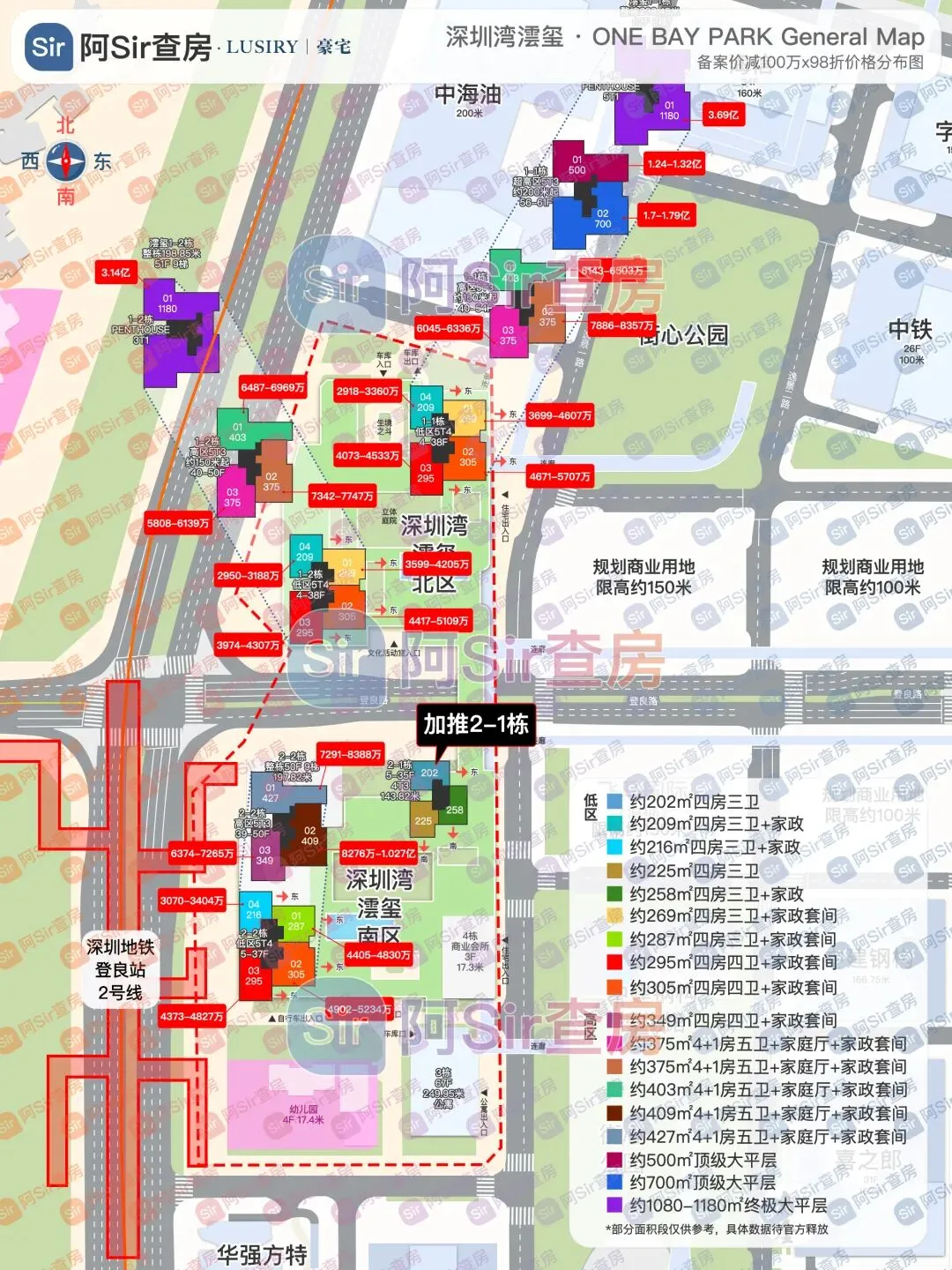 这个户型的大致布局算是此前高区403/472㎡的微缩版了,位于楼栋北向,全屋三面采光。四房三卫(双套间)设计,主阳台朝东,大采光面朝北,主卧和次卧套朝西。北边挨着登良路,阳台东北边的视野宽度还可以。大家如果想知道具体景观如何,可以联系我们看景观建模VR,目前2-1栋模型已经完成。这个户型的大致布局算是此前295/349㎡西南户的微缩版,位于楼栋西南边。同样是四房三卫(双套间)设计,比较特别的是这个户型主阳台朝正南看小区园林,侧东南看公园,不过南面视野会看到最高那栋公寓楼。另一边则跟295㎡类似,四个次卧都是大采光面朝西。2-1栋中最大的户型,位于楼栋东南边。户型是四房三卫(双套间)设计,相比同栋其他户型,这个主卧套和次卧套空间较大,还增设了一个家政间。同样地这个户型主阳台朝正南看小区园林,侧东南看公园,不过南面视野也是会看到最高那栋公寓楼。不过高楼层(100米以上)视野还是很不错的,能够远眺深圳湾大桥、蛇口。另一边大采光面朝东,可能会跟未来东侧的规划商业用地(限高150米)存在部分对视。 市场风向