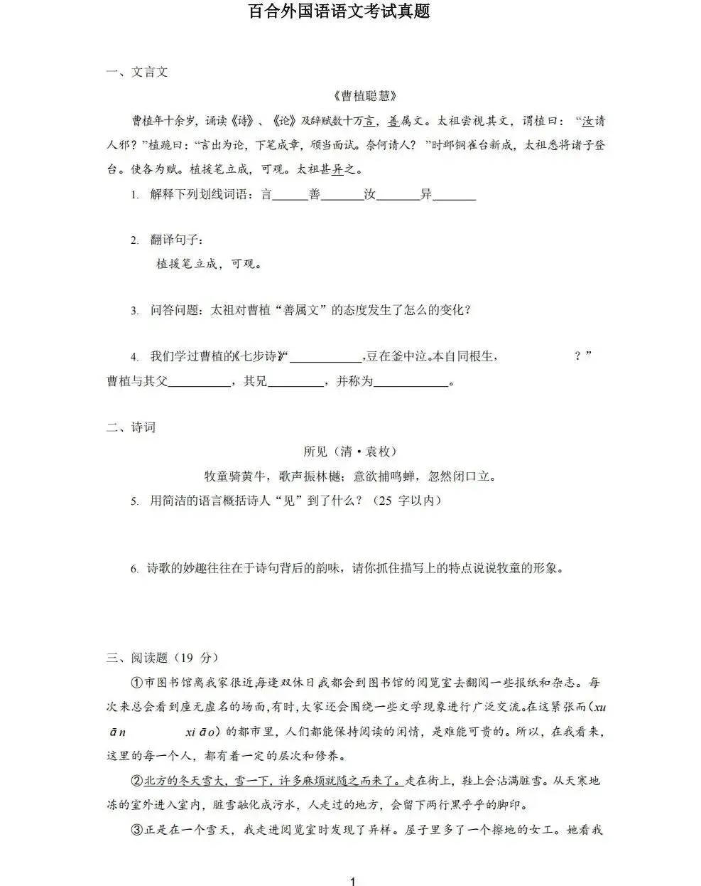 百合外国语小升初真题集(语文+英语)