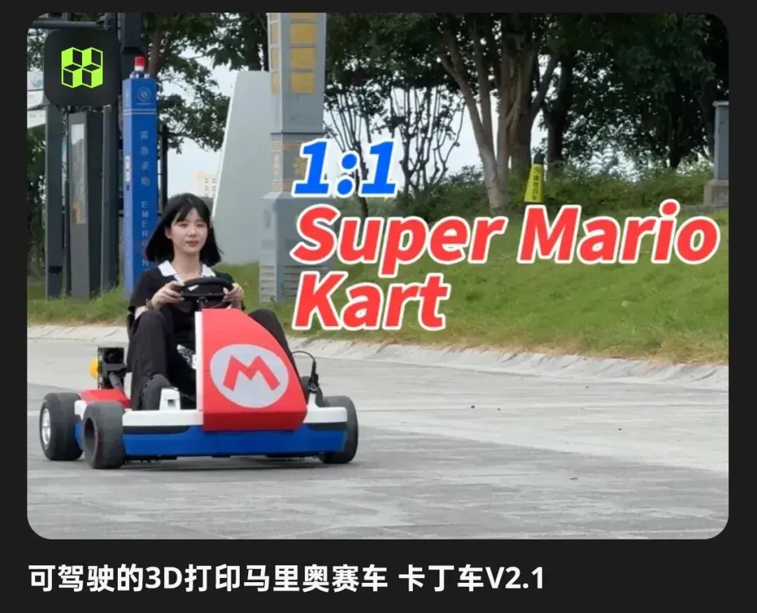 大到可驾驶的车、机器人。有网友用拓竹直接手搓了一款小型马里奥赛车,人可以坐在里面开车。