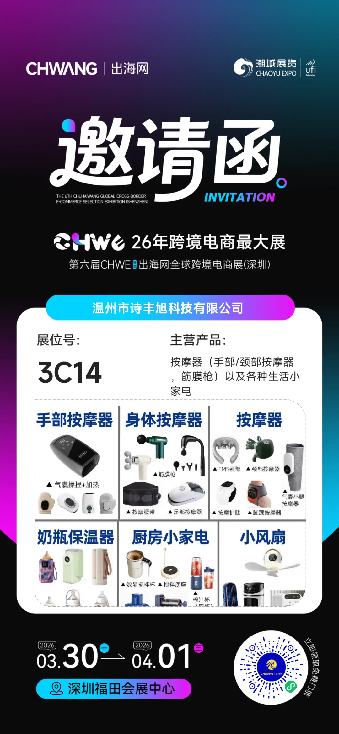 深圳CHWE展|诗丰旭温州源头工厂,跨境爆款按摩器/小家电,OEM定制供货