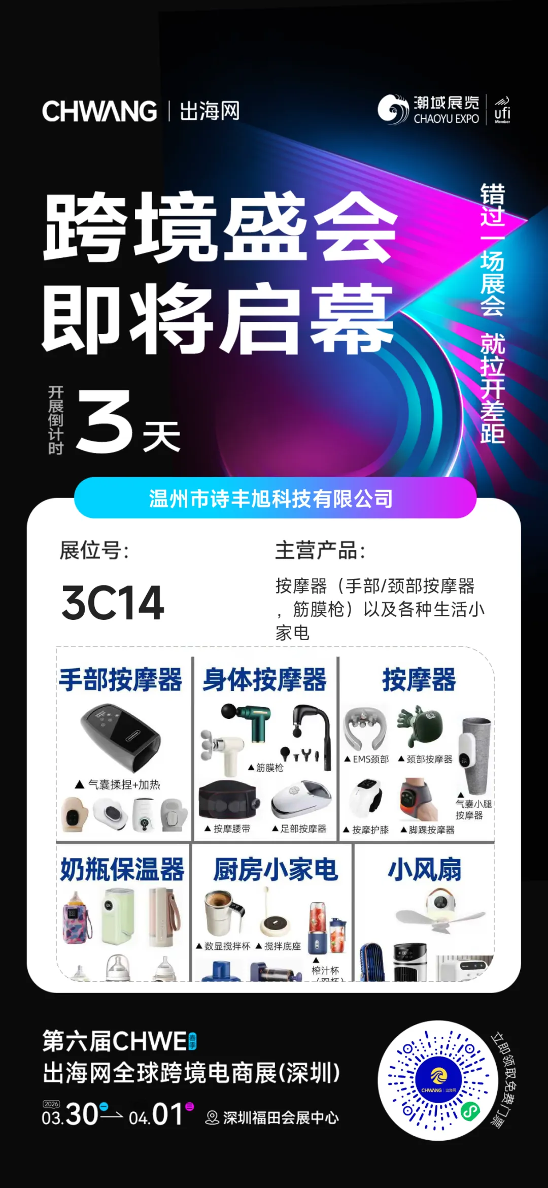 展会虽有期,合作不打烊。诗丰旭——温州实力源头工厂,专注跨境按摩器、小家电,品类丰富,资质认证齐全、支持OEM/ODM定制、FOB订单,长期稳定供货,做你省心靠谱的供货伙伴!有任何拿货、定制、询盘报价,均可添加微信咨询,免费领取【完整产品货盘】,我们全程在线,竭诚为您服务。深圳展会现场,我们静候各位光临,不见不散!