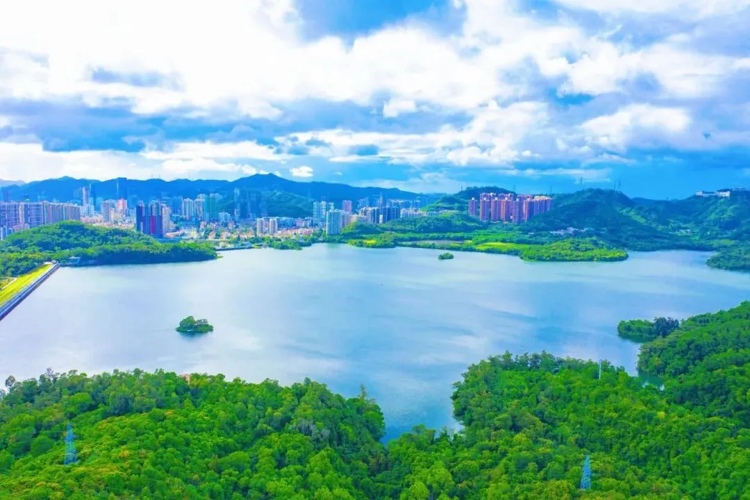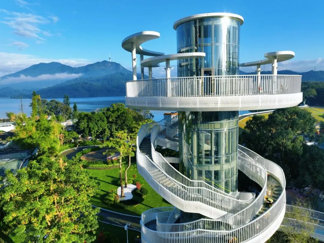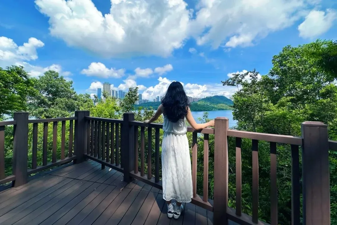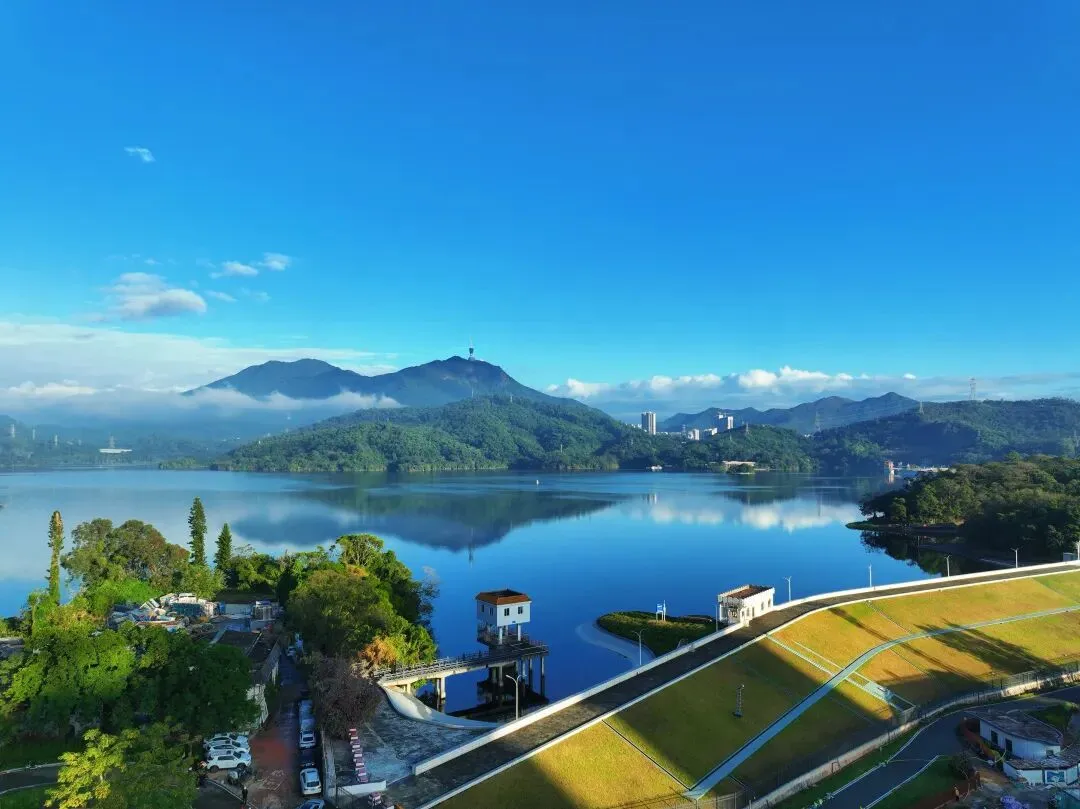 站上塔顶,绿道如带、碧波如镜,远处山城相映,脚下绿道蜿蜒,深圳水库的美景尽收眼底。