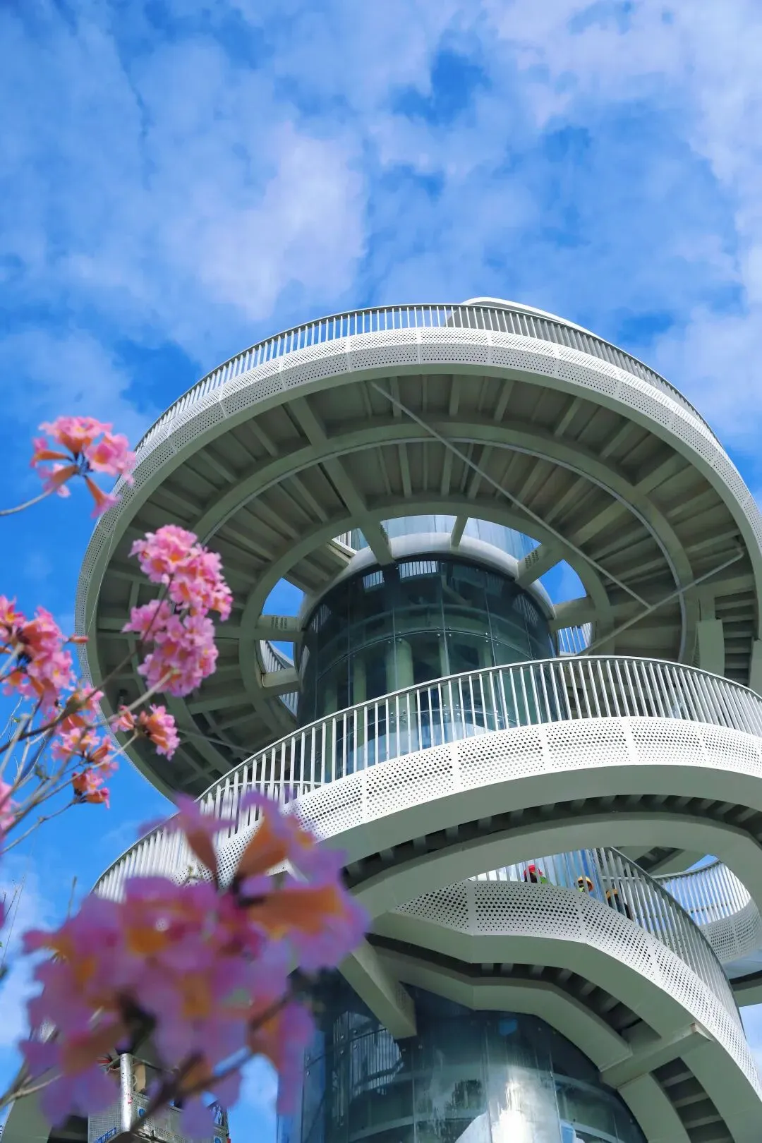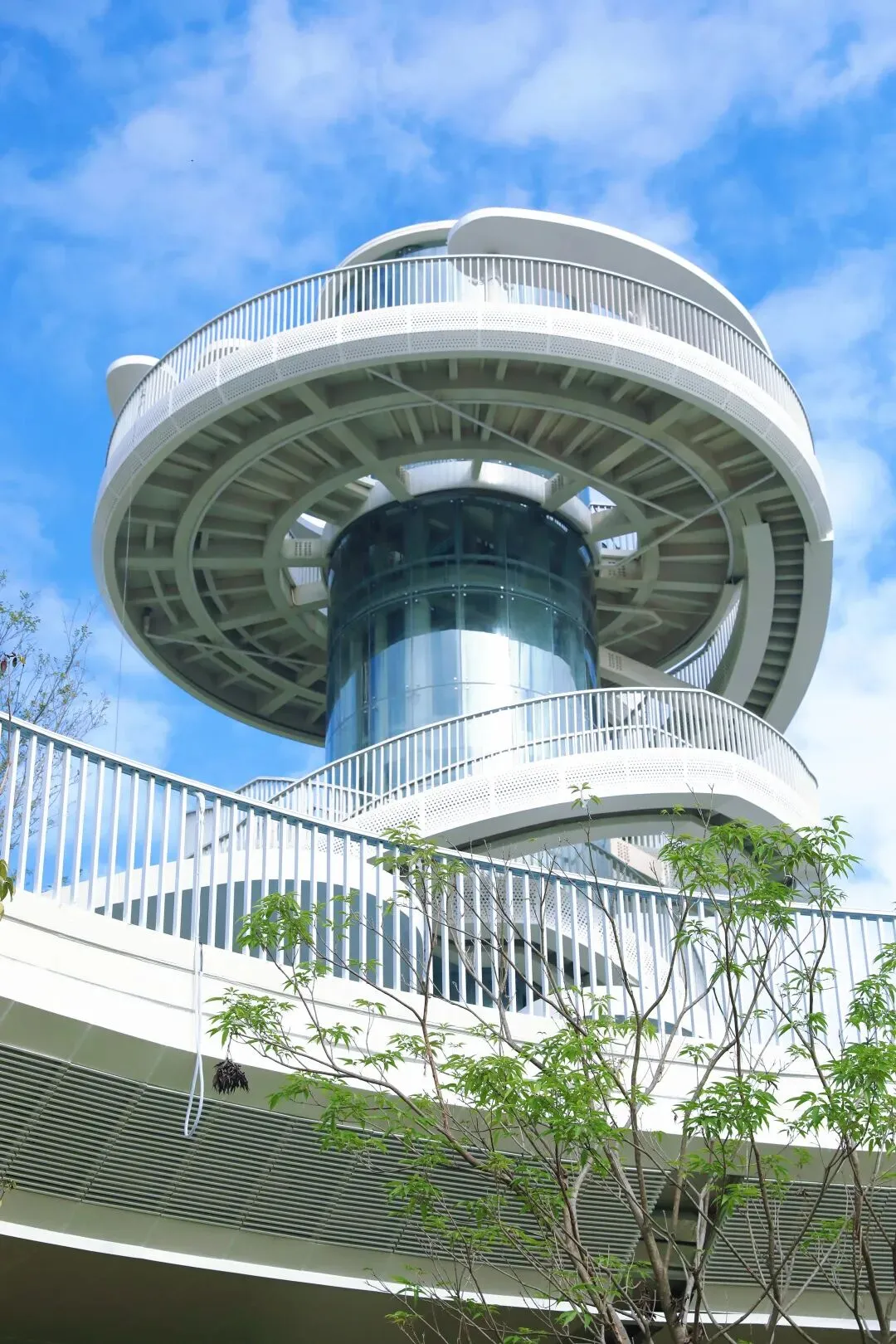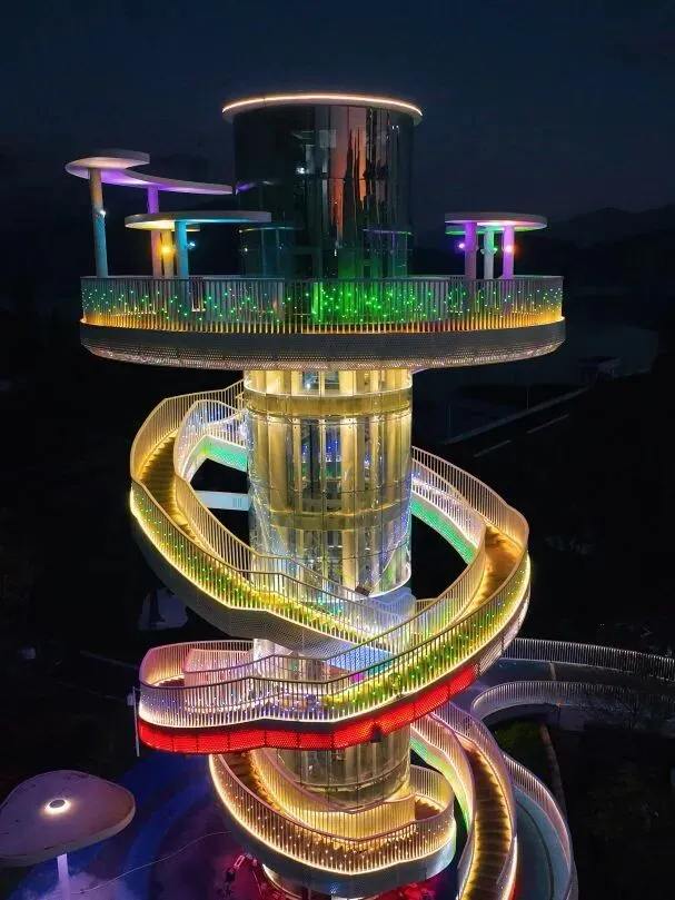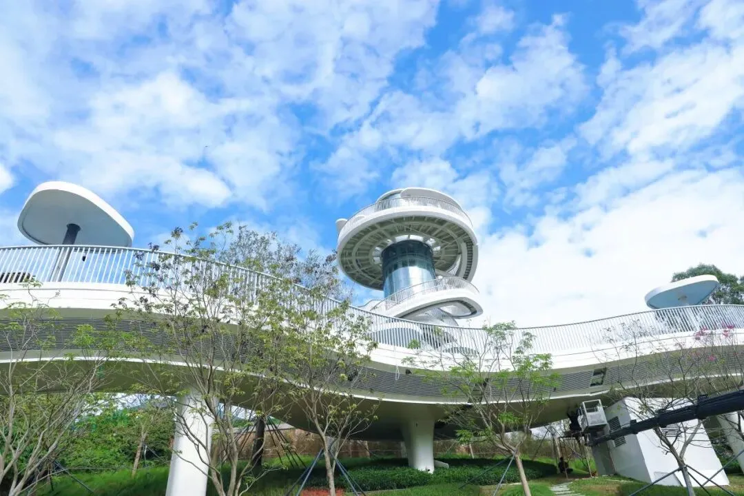 湖光塔取“湖光山色”之意,以天际流云为灵感,是俯瞰绿道的绝佳点位。塔内设有垂直电梯,也可以沿着外侧的螺旋步道慢慢观赏,一步一景。
