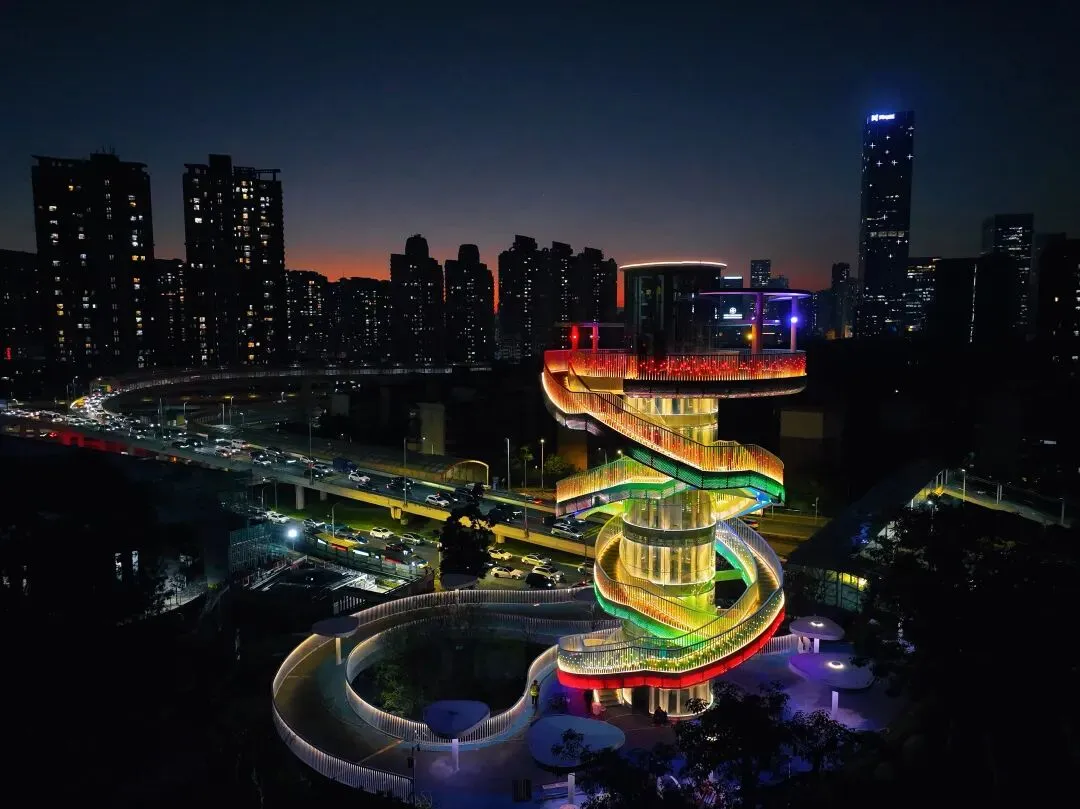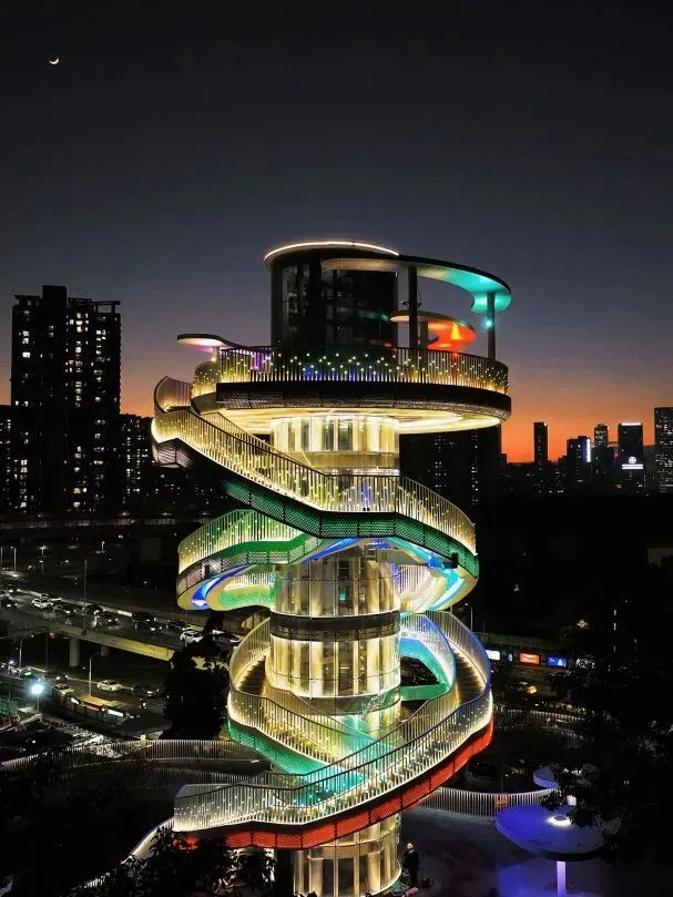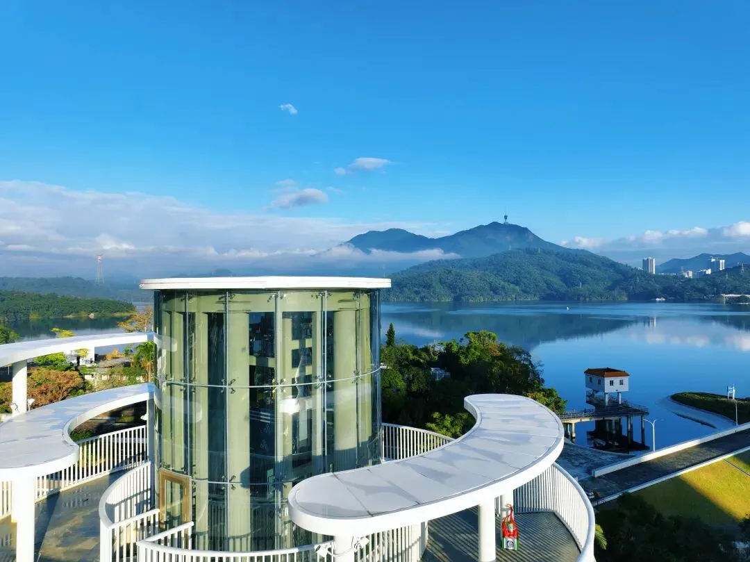 塔身镶嵌星光灯,昼夜皆成景致——白天映照着深圳水库的粼粼碧波与城市轮廓,入夜后则化作点点繁星,在城市天际线上闪烁。