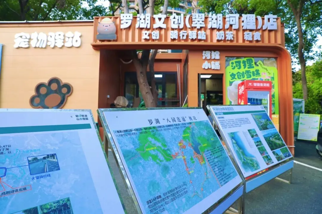 公园出口处有罗湖文创(翠湖河狸)店和自行车租还点。翠湖和东湖两个租赁点支持“异店租还”服务,让骑行之旅更加从容。