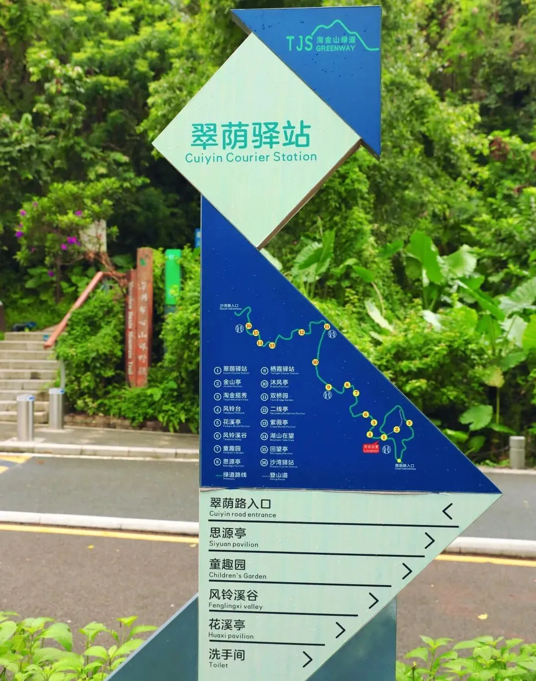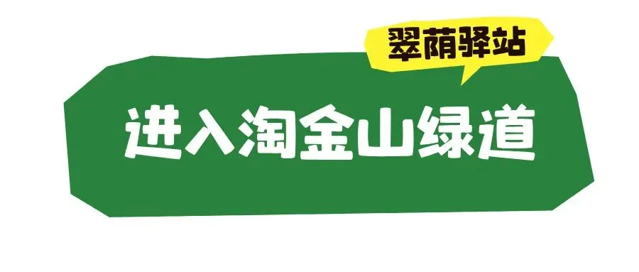 从河狸小铺出口处向右直行至三岔路口时左转上坡,途经翠荫驿站,进入淘金山绿道。
