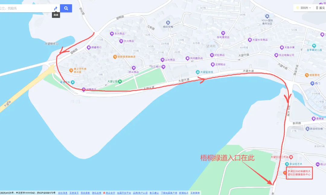 从大望桥下来,途经望桐路、大望大道、新平大道,在“罗湖区妇幼保健院大望社区健康服务中心”对面约30米处,进入梧桐绿道。