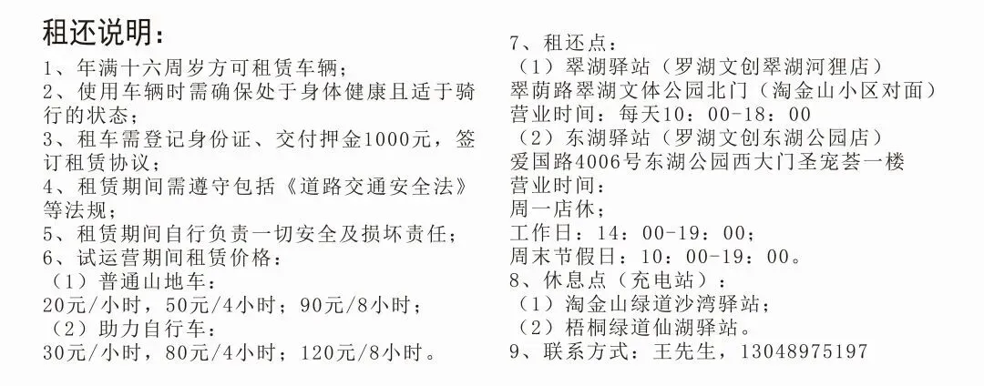 东湖公园西大门罗湖文创(东湖公园)店、翠湖文体公园罗湖文创(翠湖河狸)店旁均设有普通山地车和助力自行车租赁点。