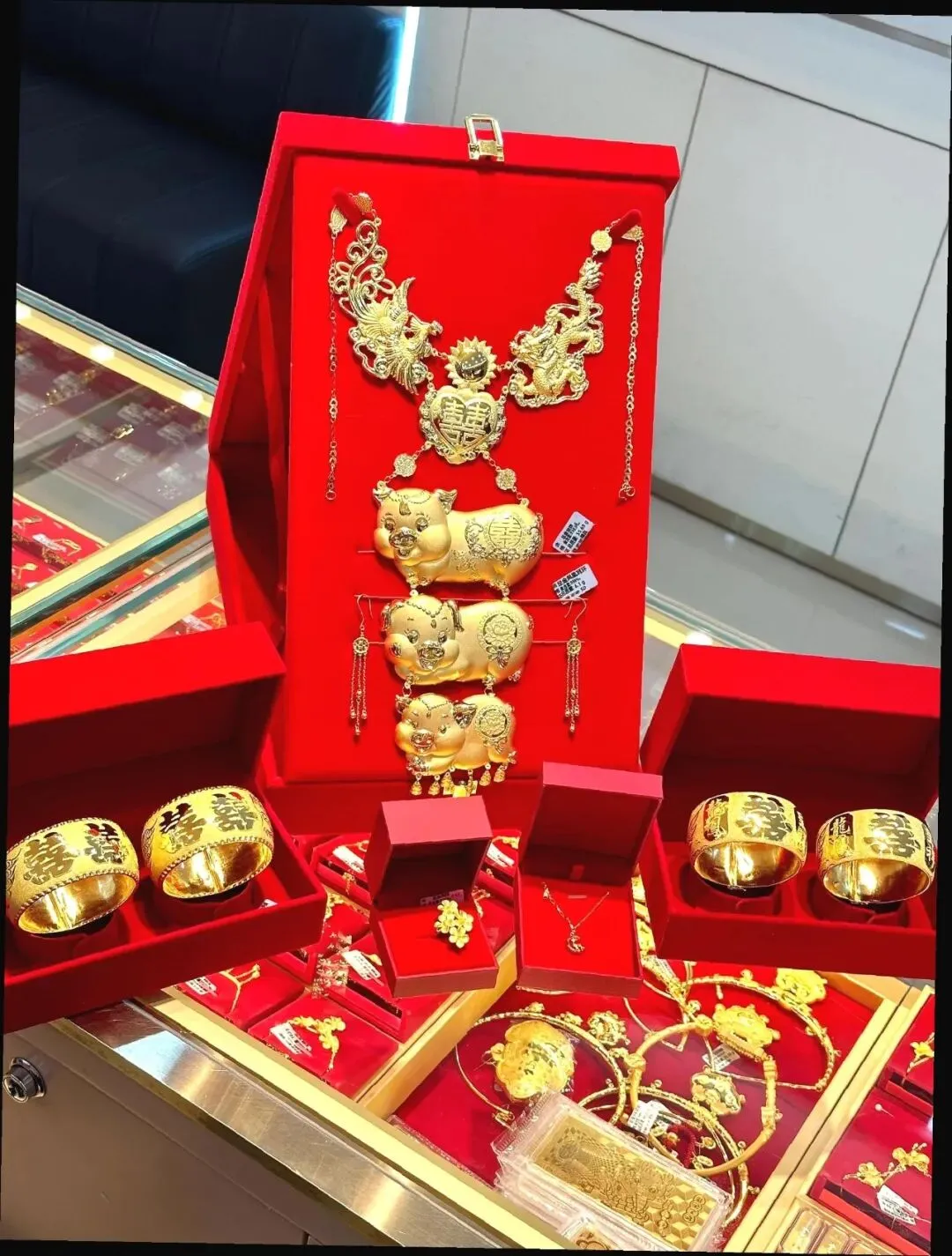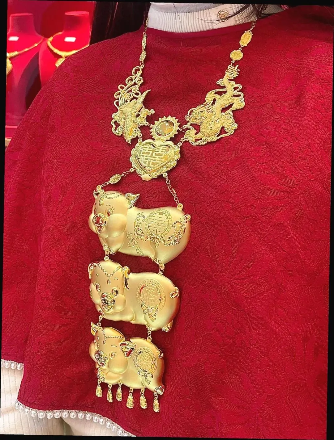 我试了那套龙凤加大吊坠的,下面还挂了三只小金猪,走一步叮叮当当的,出片是真的出片💎 但老金匠凑近看了看,说你别光看大不大,要先问清楚是足金还是18K 还有就是工费怎么算,不然回头你会心疼的