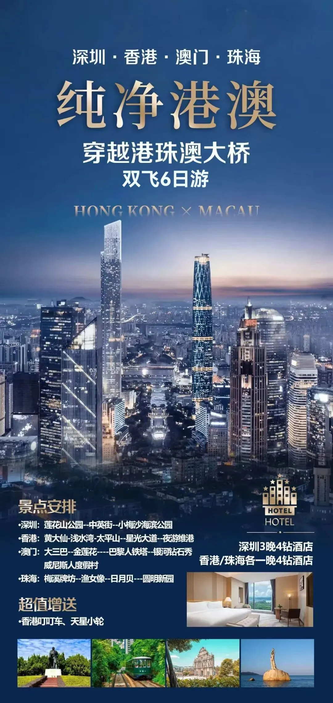 酒店早餐后出发前往香港游览【黄大仙祠】又名啬色园,始建于1945年,是香港九龙有名的胜迹之一继而前往香港经典景点【太平山】俯瞰维多利亚港、九龙本岛、香港岛全景前往香港【浅水湾】最高尚住宅区之一,香港最具代表性的沙滩参观【星光大道】为表扬香港电影界的杰出人士的特色景点,仿效好莱坞星光大道,杰出电影工作者的芳名手掌印镶嵌在特制的纪念牌匾游览完毕后再前往【香港会议展览中心】【回归纪念碑】【金紫荆广场】香港回归祖国的见证,“永远盛开的紫荆花”面朝维多利亚港,寓意着香港永远繁荣昌盛游船夜游【维多利亚港】沿着港岛北角海岸畅游维多利亚港夜景用餐:早 中 晚
