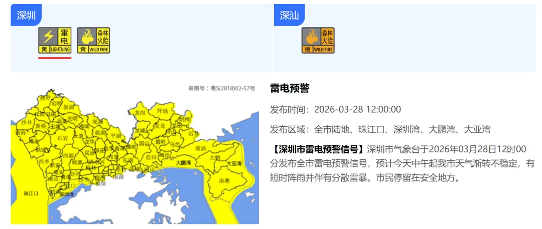 深圳市气象台于2026年03月28日12时00分发布全市雷电黄色预警信号,预计今天中午起深圳市天气渐转不稳定,有短时阵雨并伴有分散雷暴。市民停留在安全地方。