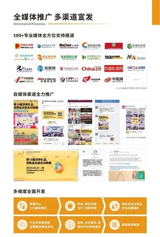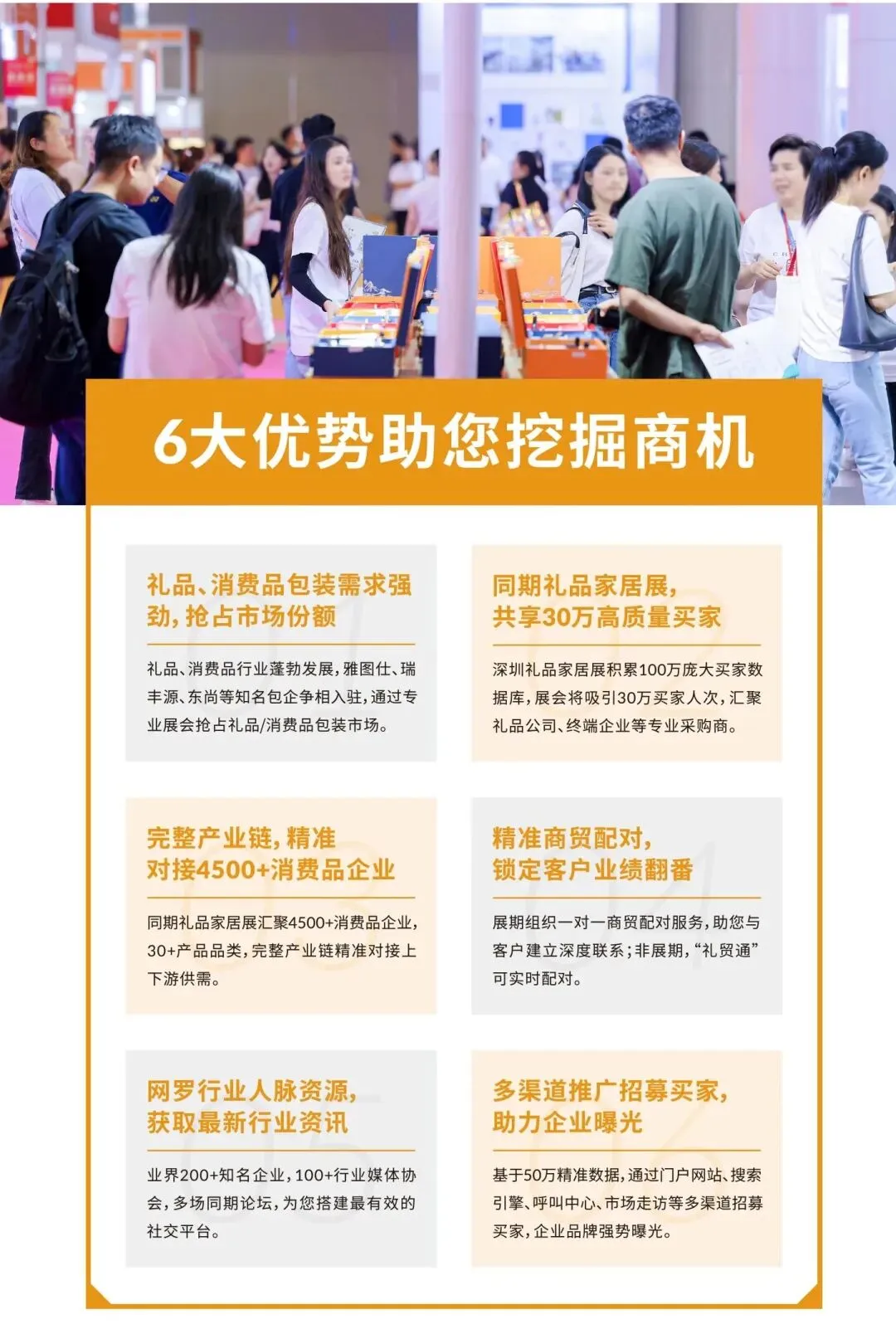 “ 深圳礼品、消费品包装及印刷展”创办于2020年10⽉,⾄今已成功举办11届。展会专注消费品创新包装,为礼品、⻝品、酒饮、消费电⼦、奢侈品、电商、跨境等⾏业提供可持续创新、新材料和设计最前沿的包装解决⽅案,促进消费品包装产业上下游商业合作,赋能⾏业发展。作为中国礼品⾏业领先的展会主办机构,旗下深圳礼品家居展被誉为“中国礼品家居第⼀展”,规模达26平⽶,展商数量4,500家,优质专业买家众多。
