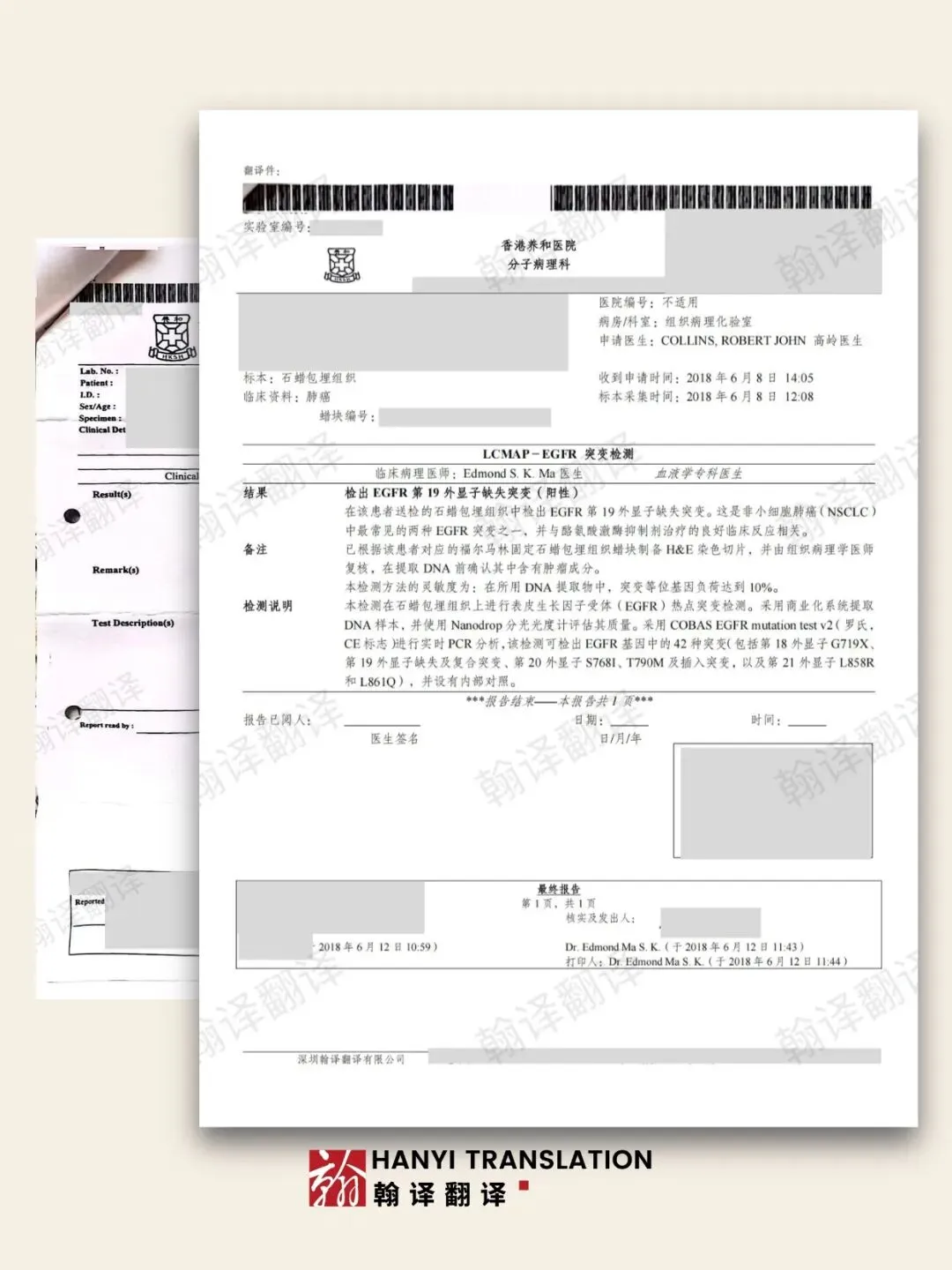 随着跨境医疗需求增长,越来越多患者持香港医院出具的英文病理报告赴内地就诊或申请保险。本文以一份真实的“香港养和医院分子病理报告”为例,解析专业医学翻译的核心要点、常见陷阱及合规交付标准,帮助患者与机构规避因翻译误差导致的误诊或拒赔风险。