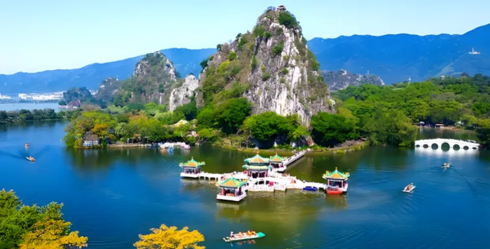 【七星岩风景区】景区由五湖、六岗、七岩、八洞组成,以喀斯特溶岩地貌的岩峰、湖泊景观为主要特色,七座排列如北斗七星的石灰岩岩峰巧布在面积达6.3平方公里的湖面上,故名“七星岩”;七星岩摩崖石刻是南中国保存得最多最集中的摩崖石刻群,记载了自古名人游玩七星岩的踪迹。