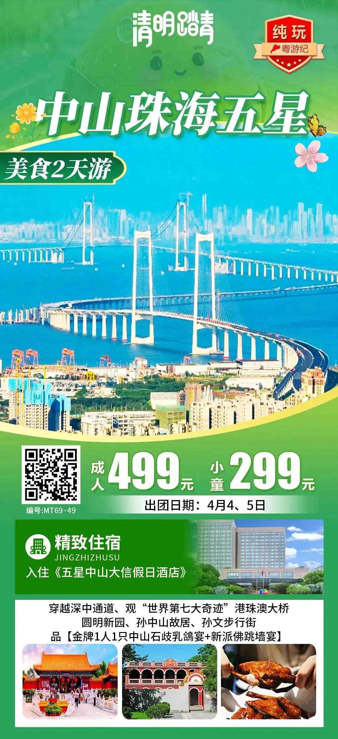 穿越深中通道、住《五星中山大信假日酒店》、观“世界第七大奇迹”港珠澳大桥、圆明新园、孙中山故居、孙文步行街、品【金牌1人1只中山石歧乳鴿宴+新派佛跳墙宴】美食2天出团日期:4月4、5日
