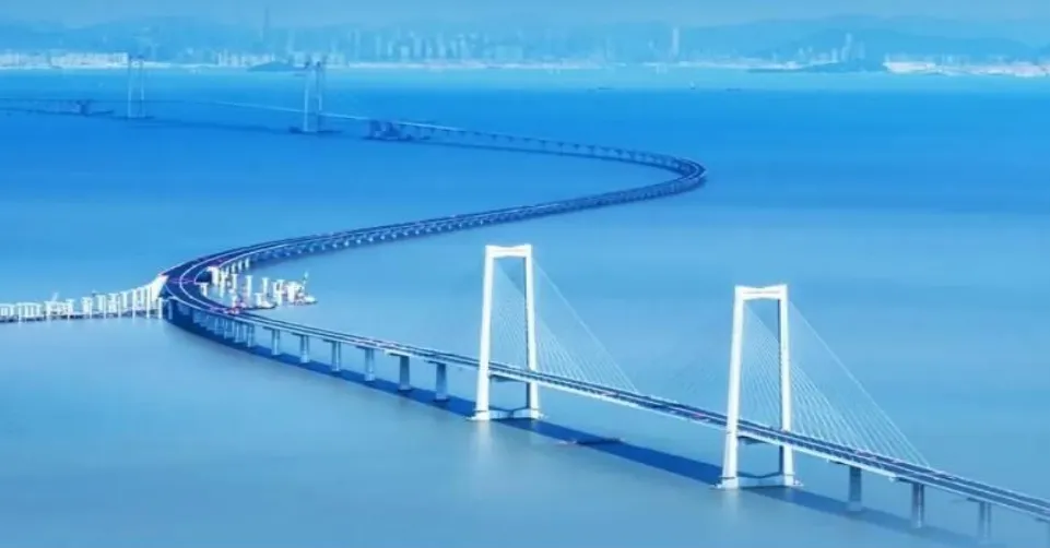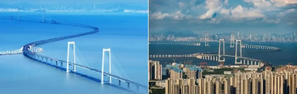 地处粤港澳大湾区核心区域的超级工程—【深中通道】项目全长约 24 公里,其中桥梁工程长约 17 公里,用时8年建设的,采用设计速度 100公里/小时的双向 8 车道高速公路技术标准,是国内首座采用钢壳混凝土组合结构建造的海底隧道,是集“桥、岛、隧、水下互通”为一体、当前世界上综合建设难度最高的跨海集群工程。