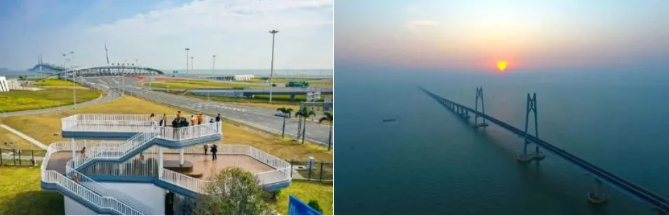 参观【港珠澳大桥·望桥驿站】和【港珠澳大桥·遇见大桥观景台】【景区介绍】:【港珠澳大桥珠澳公路口岸】是我国唯一的三地互通、客货兼用的陆路口岸。上面特别设计了一段【桥文化长廊】和观景台:全面展视了由古至今桥梁的变更,从古诗词描述的桥到跨越时代变迁的桥的发展历程。【望桥驿站】一个集咨询服务、拍照打卡、咖啡品尝、文创臻选于一身的观景中心。“望桥驿站”紧靠海边,橙白色的建筑风格显得活力十足。站上二层,远眺大桥壮美身姿,可谓是绝佳观赏地段。近距离感受世界级工程、世界新七大奇迹之一【港珠澳跨海桥】。