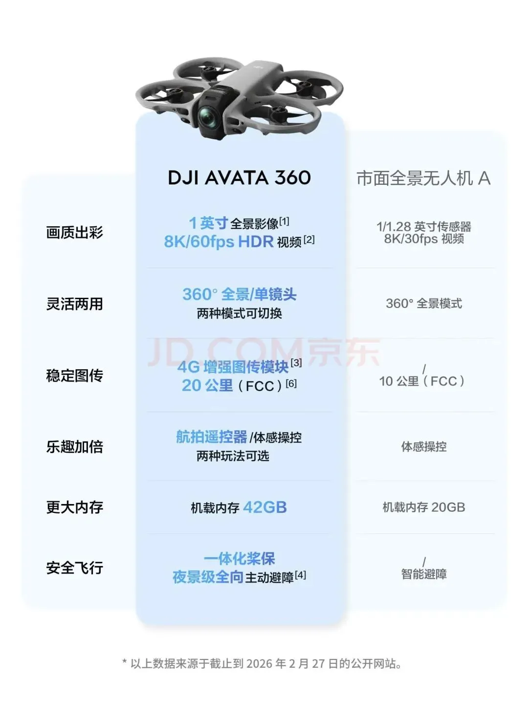 影石全景无人机「影翎 A1」定价 6799 元,主打沉浸式飞行体验;大疆随后推出「Avata 360」全景无人机,以更强画质、更稳图传、双模式操控形成直接对标。