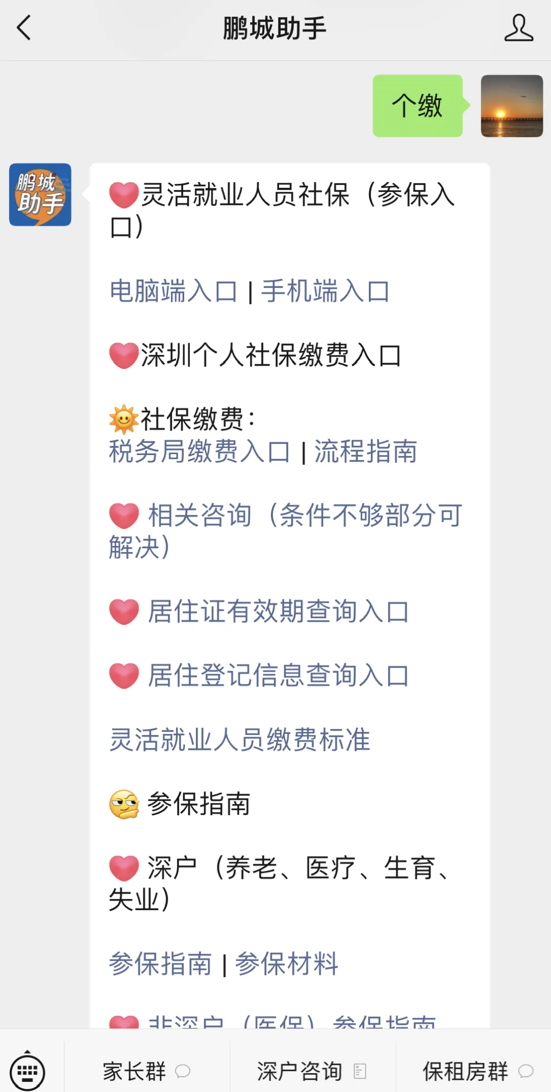 ①大家可以在本公众号或者在【鹏城助手】回复【个缴】,点击税务局缴费入口
