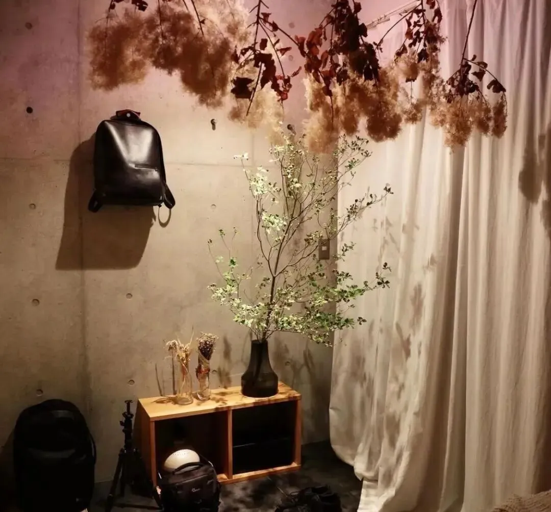 你看这角落,水泥墙配原木柜,没硬凹。包直接上墙挂,地面就干净了。