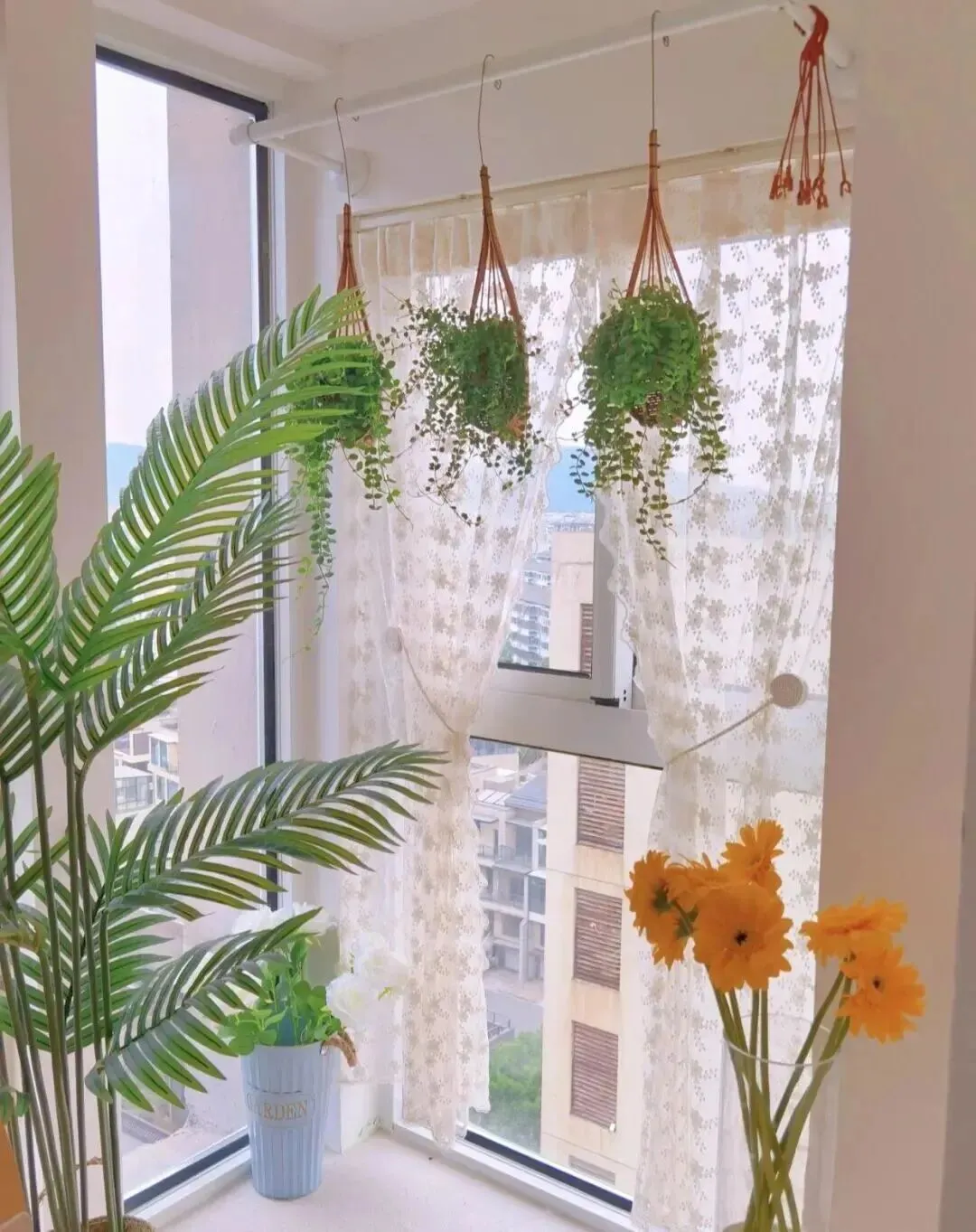 窗边这块做得聪明。纱帘把光线揉软,吊挂植物不占地面。