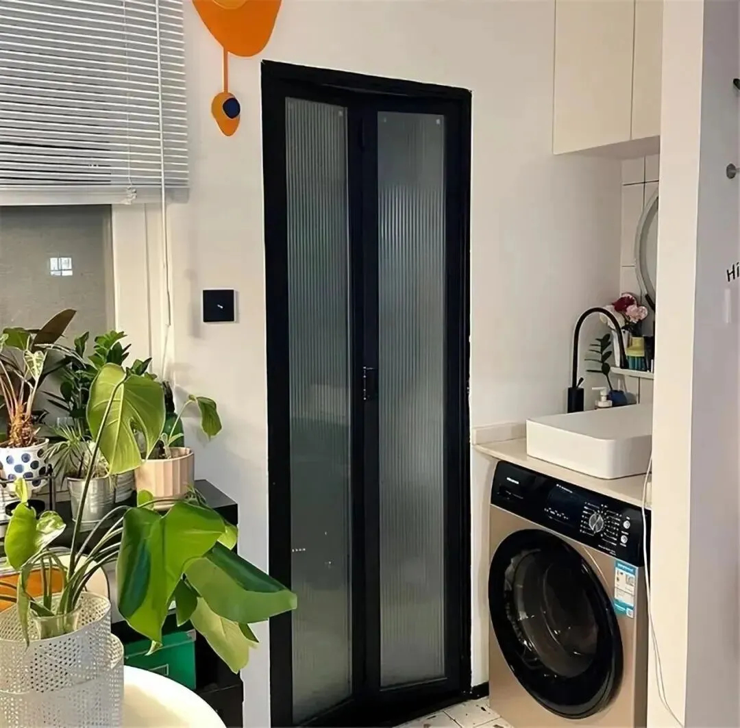 卫生间门这块我也盯到了,黑框玻璃门挺利落,视觉也扩容。