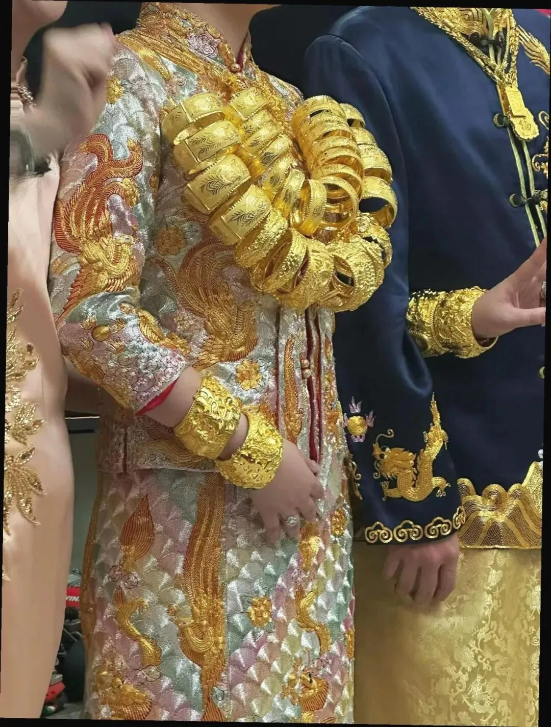 昨天在深圳参加婚礼 我真的被刺激到了 新娘那套衣服一上身 金光直接把我闪到眯眼 手上是一排排的大镯子 还有一串串戒指 我心里第一反应是 哇 这也太有排面了吧🔥