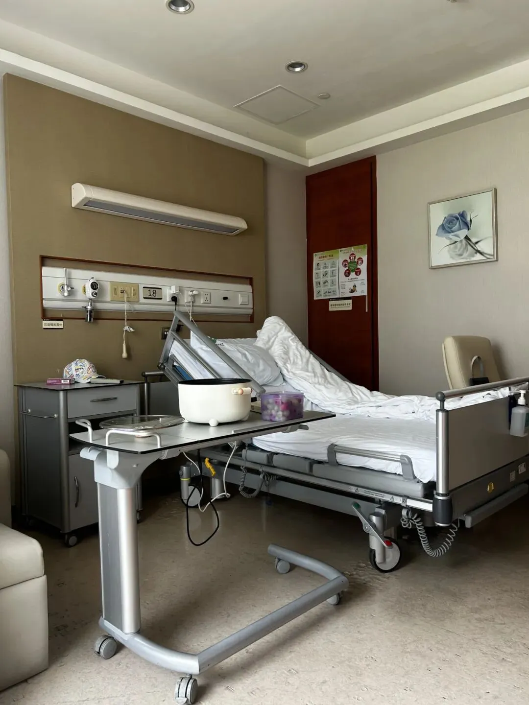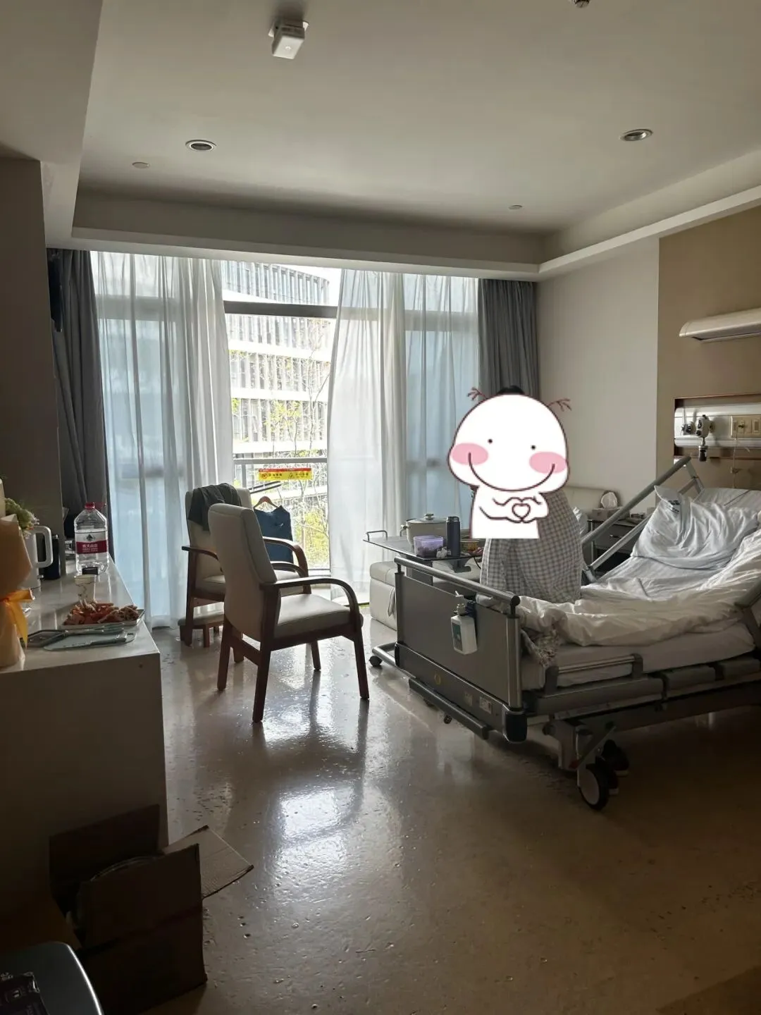 单人间病房面积不算特别大,有的带小阳台,有的没有,价格也因此不同,区间在1200到2000元。朋友住的这间带小阳台,属于最高的2000元档位。