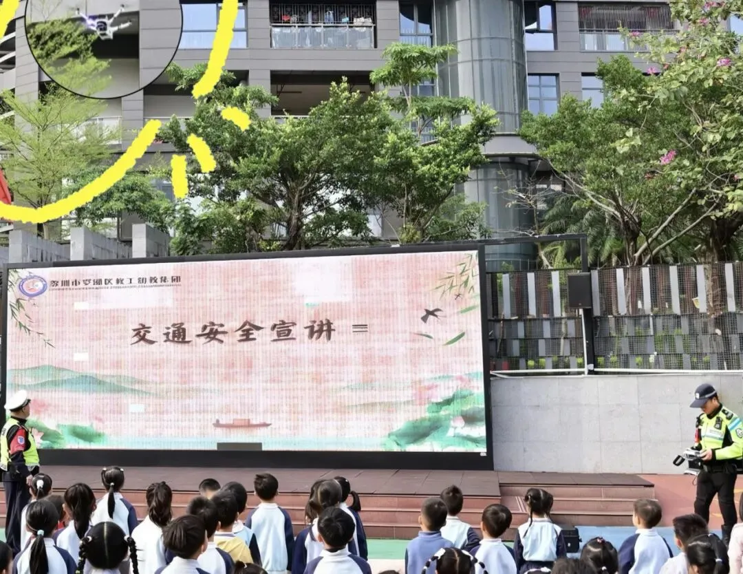 “快看!无人机!”——交警叔叔带着“空中警察”来啦!两位警官一亮相,就用无人机高空巡逻,孩子们仰着小脑袋看得入迷,在惊呼声中把交通安全知识装进小脑瓜,原来无人机也可以高空巡查路况、快速发现拥堵与事故呀!真是太厉害了!