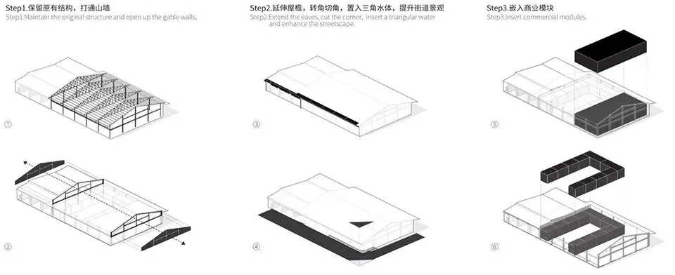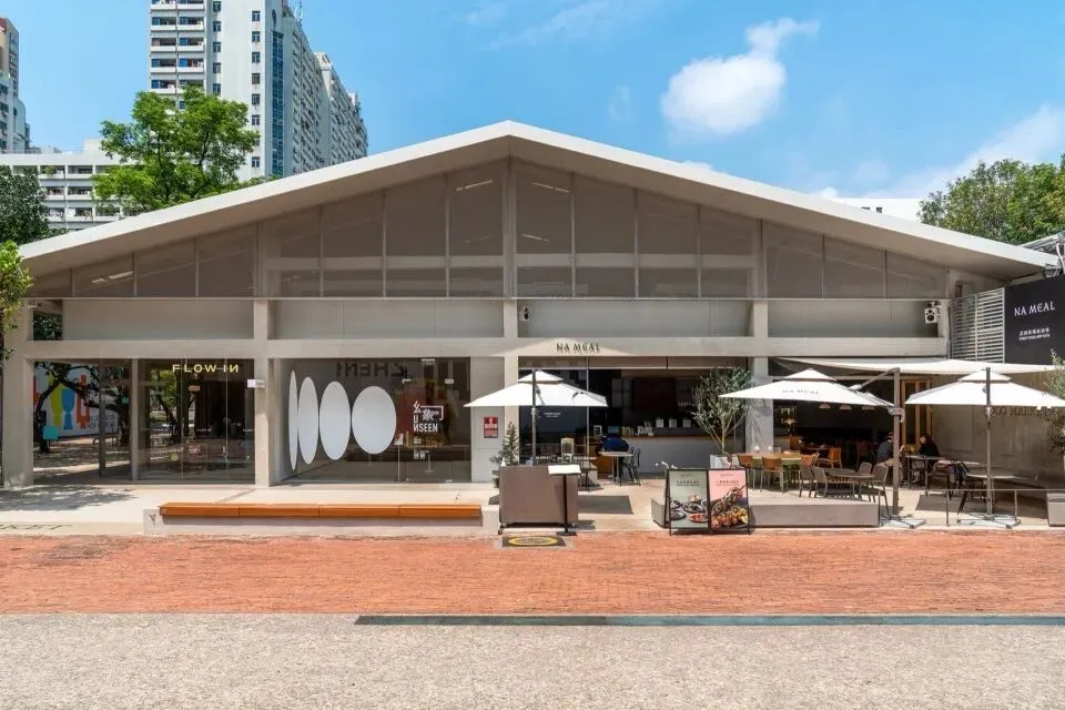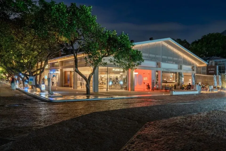 设计拂去尘埃,让场地的筋骨自然显现:拆除陈旧装饰,保留工业质感的钢构屋顶,还原建筑轮廓与框架;打通东西山墙,形成贯穿的自然风道与视觉长廊。大屋顶、原生树与山墙的韵律在“减法”中渐次清晰,铺就纯粹的空间叙事基底。随后,轻盈的商业模块被悄然嵌入其中。朴素的混凝土框架与通透的玻璃盒子相融共生,既遮蔽风雨,又引入天光,塑造出“檐下·树下”的灰空间体验。