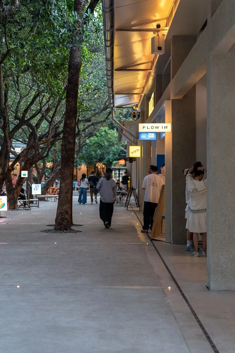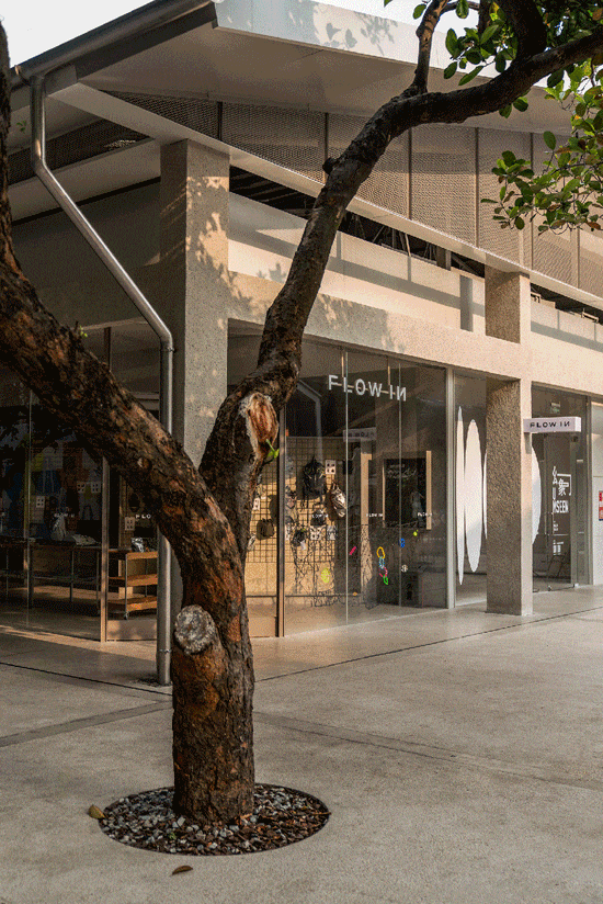 空间的活力由此被激发,而设计的克制则让这份活力得以从容生长。建筑的统一性并非来自强加的风格,而是通过一套克制的材质语言——朴素的混凝土、裸露的钢架、通透的玻璃为多样的商业内容设定了中性背景;细节之处的考量,如雨水管、门把手、室内外地面的粗糙度对比,皆是建造逻辑的真实呈现。在此框架下,店铺内部的白墙与混凝土形成微妙对比,活动式家具则允许空间形态被自由定义。